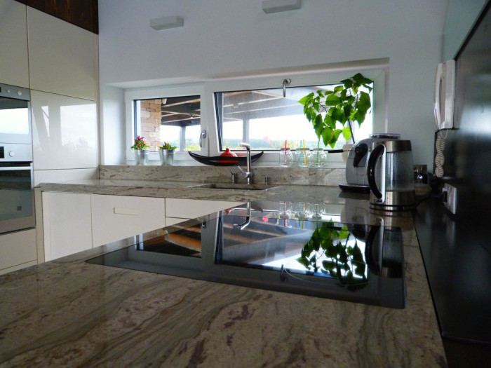 Celý interiér této přízemní dřevostavby je navrhovaný na míru s ohledem na jeho atypické tvary. Obytný prostor je otevřený do krovů, kde je umístěna galerie s pracovnou, a je oddělen od vstupní haly prosklenou stěnou. Srdcem domu je otevřený prostor s krbem (krbová vložka na míru doplněná přírodní betonovou stěrkou) volně navazující nadčasovou kuchyní v bílém lesku do tvaru písmene U, s pracovní deskou z přírodního kamene a dřeva.