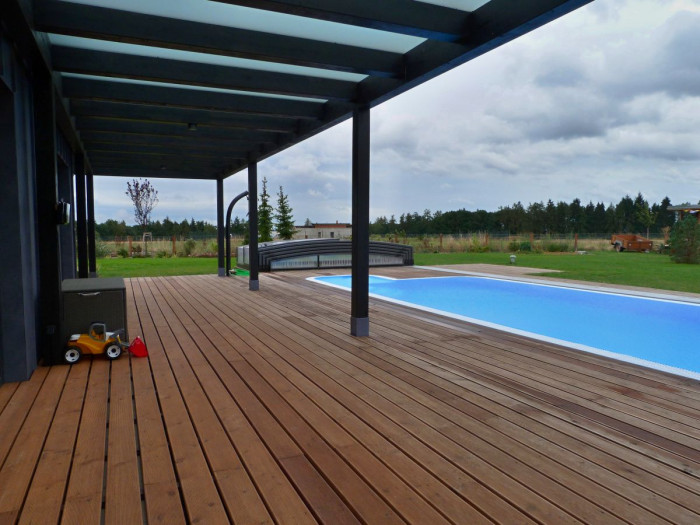 Drásané smrkové dřevo je použité na jídelní stůl a lavici. Dalším zajímavým prvkem v interiéru je dominantní dřevěné schodiště, které vede na horní galerii s pracovnou. Dům má dvě terasy a velké prosklené plochy, které interiér krásně prosvětlují denním světlem. Západní terasa nabízí propojení domu s bazénem, zahradou, posezením a výhledem do přírody. V chladnějším období ji tak lze využívat jako tu teplejší variantu pobytu venku. Východní terasa, naopak naskýtá výhled na golfové hřiště, a v létě se zde majitelé mohou ukrýt před horkým sluncem.