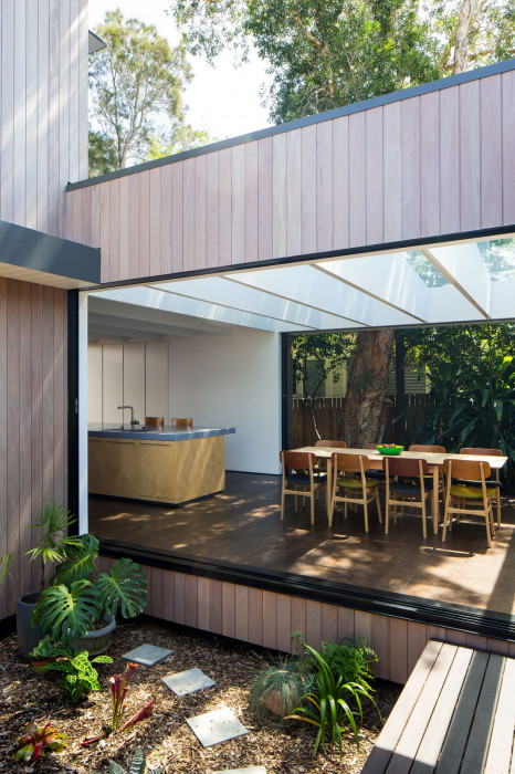 Dům Catalina Crescent od pH+ Architects se nachází v oblasti Northern Beaches v Sydney a představuje rozšíření a zároveň oslavu tradiční architektury australských dřevěných domků. Novostavba vyrůstá ze zadní části staršího domu, jenž je takto zásadně expandován o smělou současnou vrstvu, navazující dialog s ním i se svým okolím. Catalina Crescent vychází z klientovy touhy rozostřit hranici mezi bydlením venku a vevnitř – velké části domu se tak otvírají do obou rozměrů.