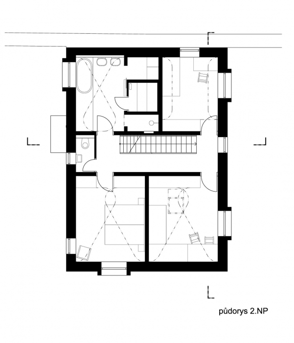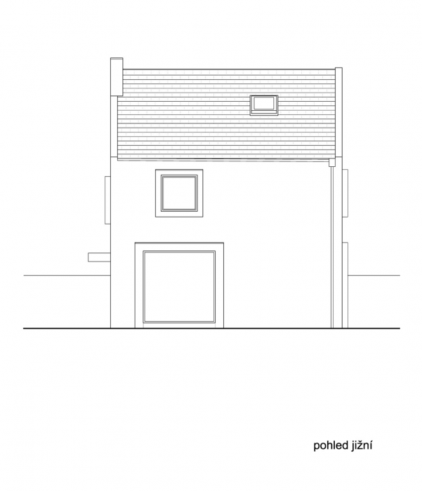 Návrh domu přebírá hmotu původní stodoly s hřebenem rovnoběžně s ulicí. Navazuje na sousední stavbu se shodnou výškou. Půdorysným odstoupením od sousedního štítu vzniká nezastavěná mezera, která umožňuje lépe osvětlit vnitřní místnosti domu. Prostor je využit také pro venkovní stání automobilu.
