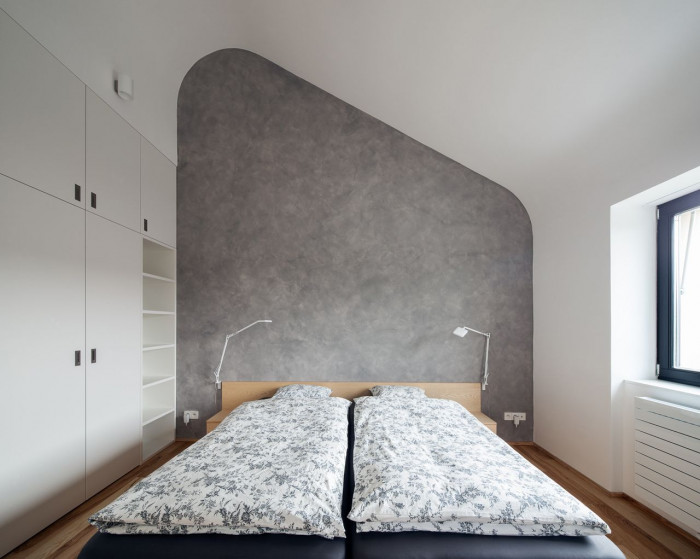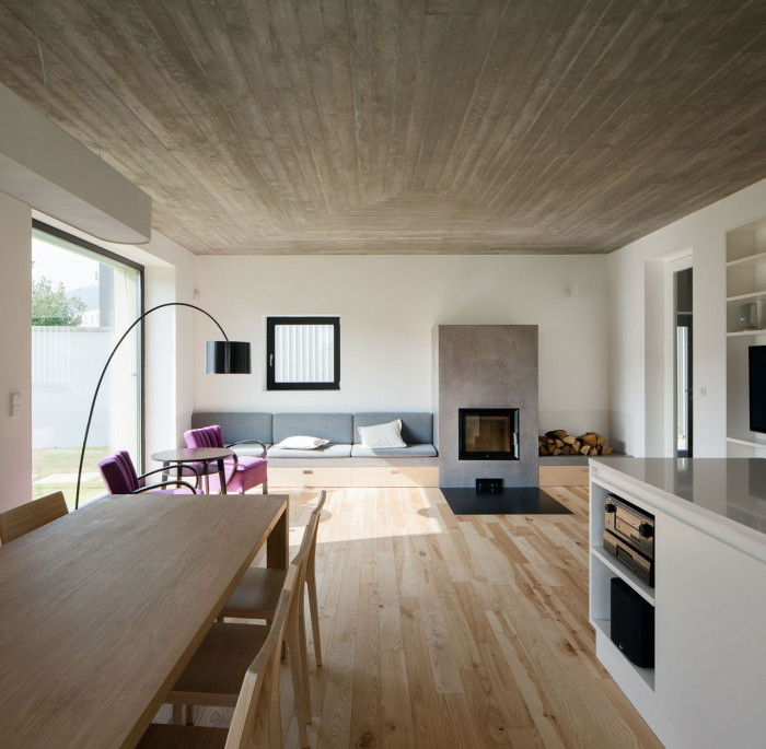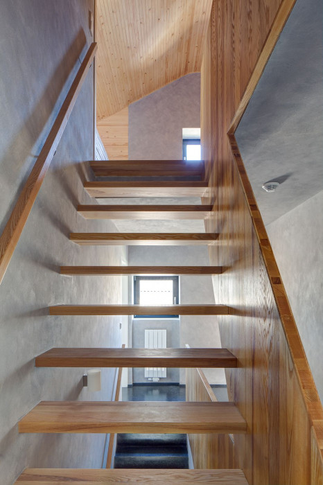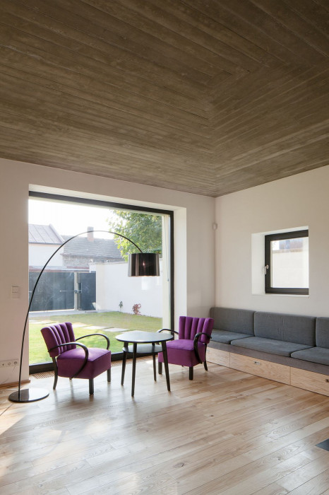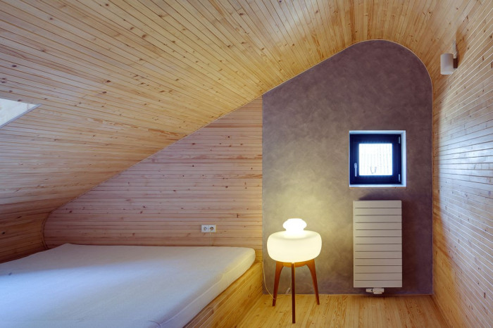 Vnitřní prostory domu jsou utvářeny jako rozmanité světy pro jednotlivé členy rodiny. Světlé místnosti kontrastují s tmavší schodišťovou halou. Obytný prostor má přiznaný betonový strop litý do laťového bednění uspořádaného do spirály. Ložnicím v patře pod střechou dodává útulnost klenutý podhled. Ve vrcholu hřebene se skrývá dřevem obložené doupě pro děti a návštěvy.