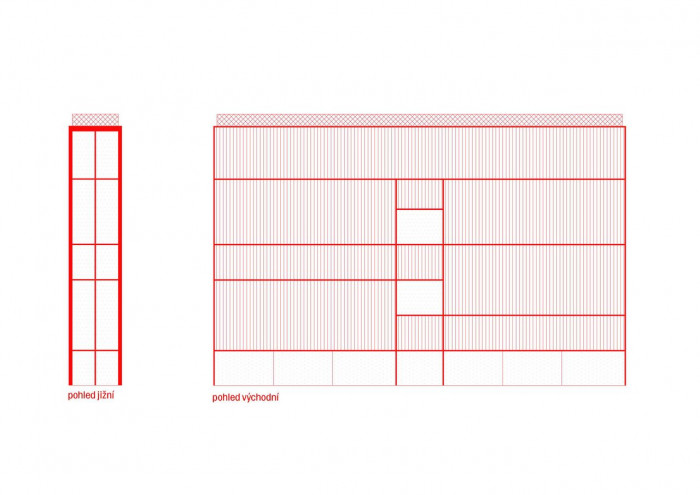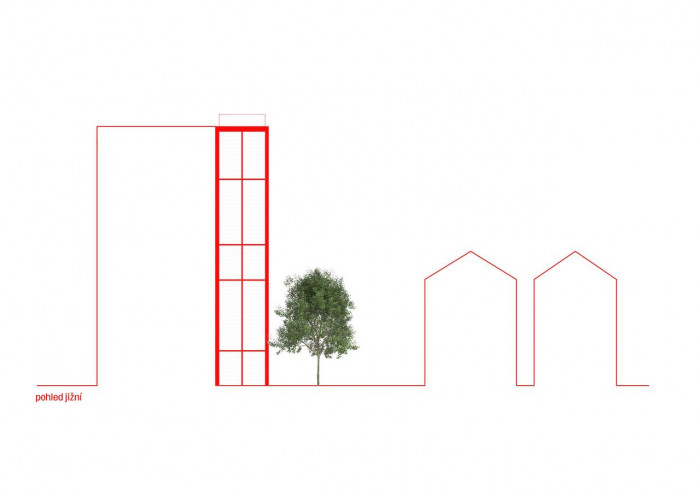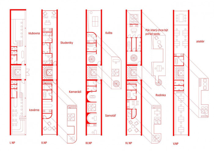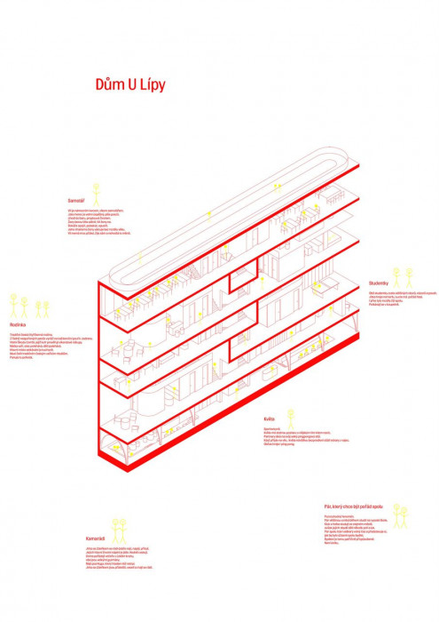Využití maximální možné zastavitelnosti parcely. Základním principem je vytvoření úzkého nádvoří, které tu zůstane i v případě zastavění vedlejší parcely. 6 bytů, 12 obyvatel, ateliér, kavárna, klubovna.