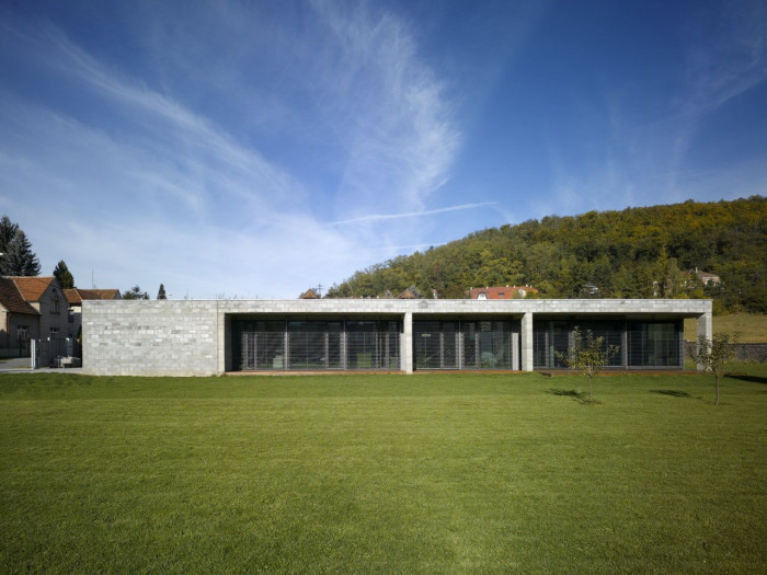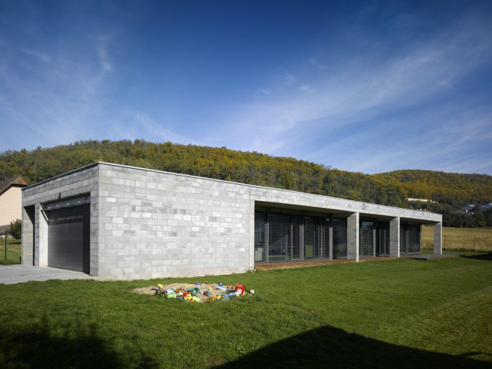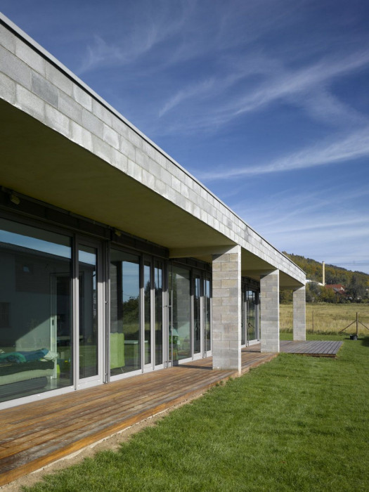 Dům je koncepčně navržen jako přízemní jednoduchý protáhlý hranol z betonových pohledových tvárnic. Plná zděná hmota je směrem do zahrady odlehčena ustoupením proskleného průčelí, které vytváří krytý prostor pro terasu.