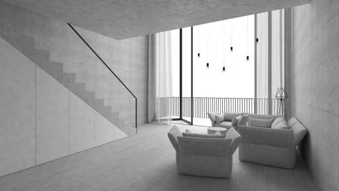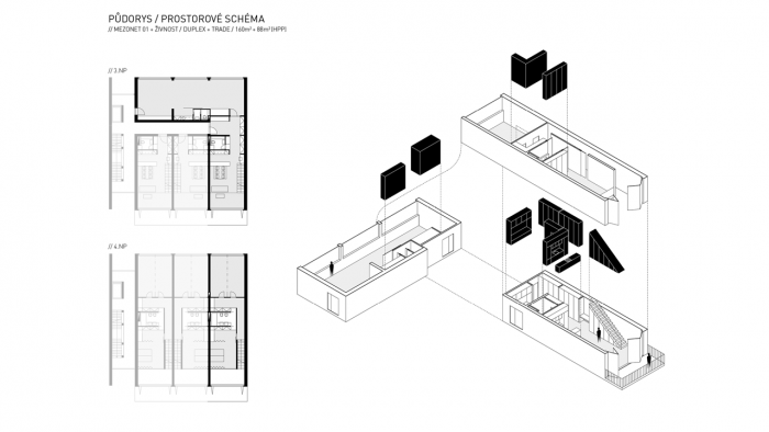 V dalších podlažích sehrála významnou roli orientace domu sever-jih, kdy severní fasáda směřuje čelem do ulice a jižní k vnitrobloku. Stavba obsahuje 1 loft (pro majitele), 4 mezonety a 2 byty, které se hlavními prostory otevírají do jižní části fasády, dále 2 univerzální prostory (kanceláře/ateliér/ordinace), které využívají fasádu severní. Vysoký důraz byl kladen také na flexibilitu jednotlivých prostorů – 3 podlažní komerční prostory mohou fungovat jako 2 nezávislé celky. Univerzální prostory mohou opět sloužit jako nezávislé celky nebo mohou být napojeny na koncové jednotky mezonetu a loftu, což vytváří další pracovní příležitosti a zvyšuje diverzitu celého objektu. Mohou tu tak fungovat i rodinné firmy, či jinak sdílené komunitní prostory. Z vynechané hmoty objektu se stávají pobytové terasy, které slouží jako vnitřní veřejný prostor. Zcela otevřené zážitkové schodiště nabízí zajímavé průhledy na obě světové strany. Všechny vnitřní poloveřejné komunikace jsou navrženy tak, aby šel uživatel domu vždy za světlem.