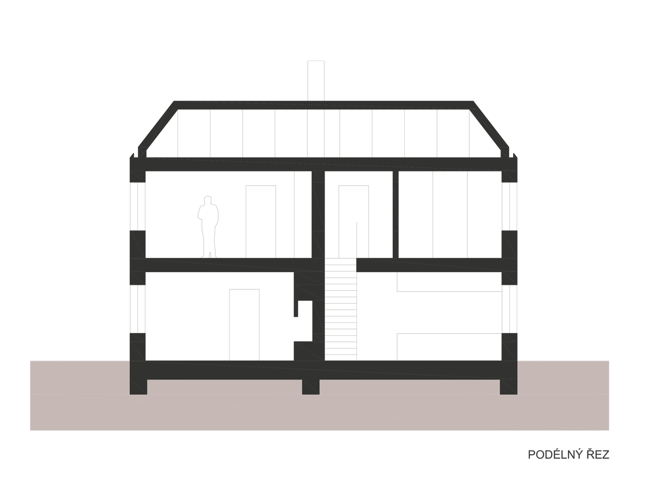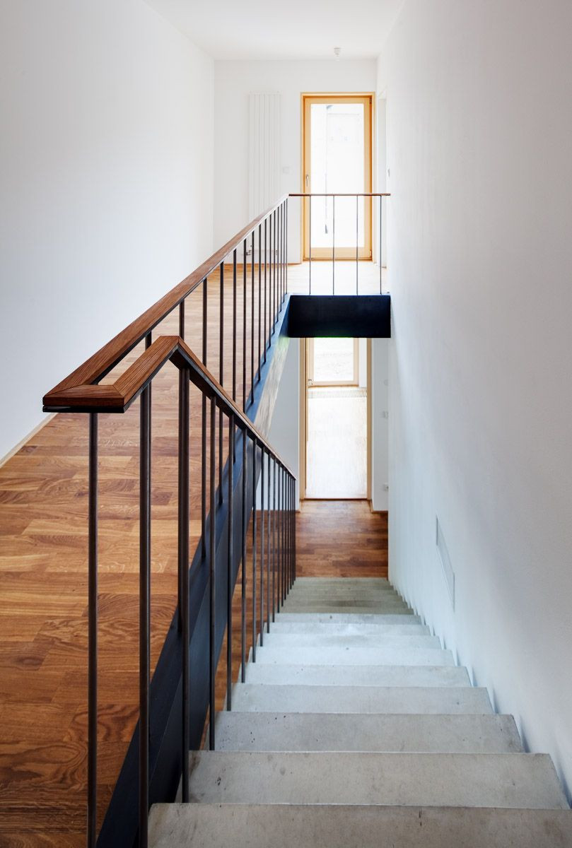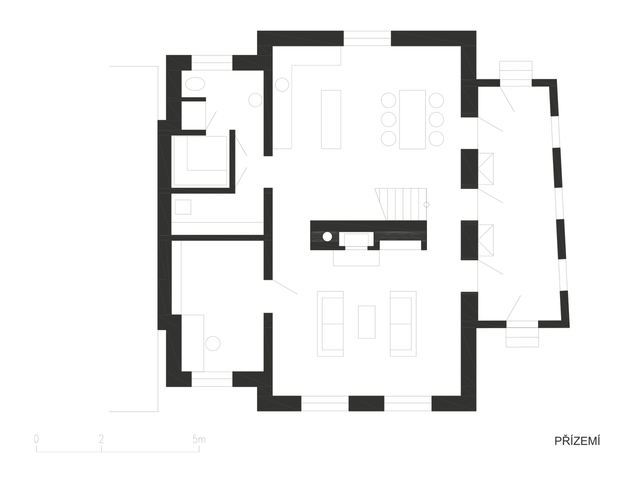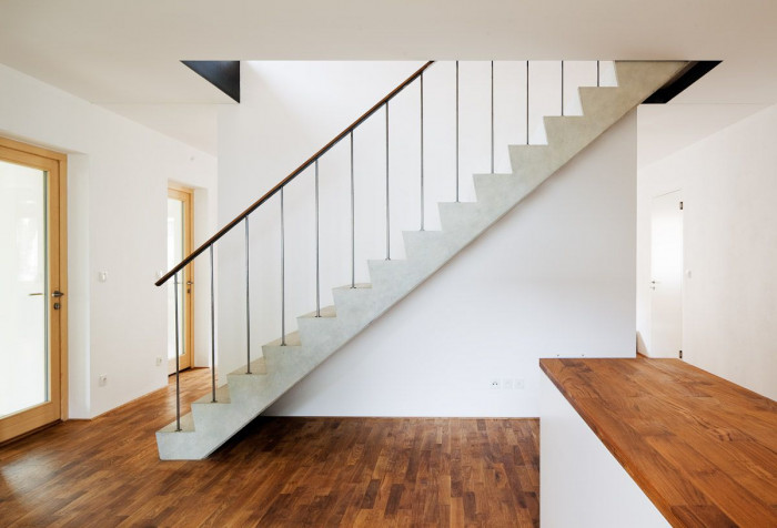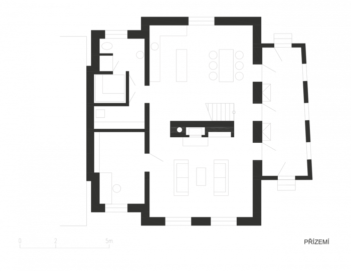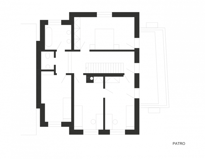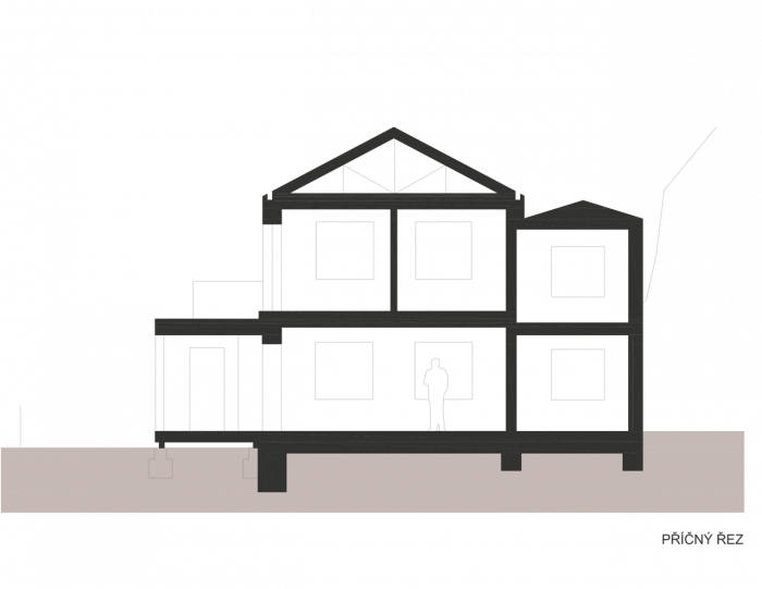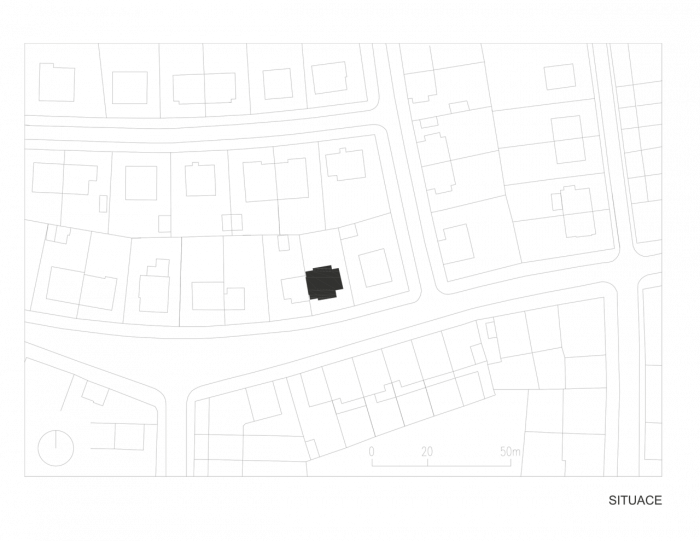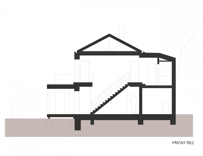 Do domu i na zahradu se vstupuje přes verandu, která je pojata jako lehká dřevostavba s pochozí střechou. Vnitřní dispozice vychází z plánu rekonstrukce a maximálně využívá omezený prostor pro potřeby rodinného bydlení. Propojením místností v přízemí vzniká otevřený obytný prostor, v patře jsou malé, ale funkční a světlé pokoje. Koupelny jsou umístěny v krčku. Schodiště je prefabrikovaný betonový monolit.