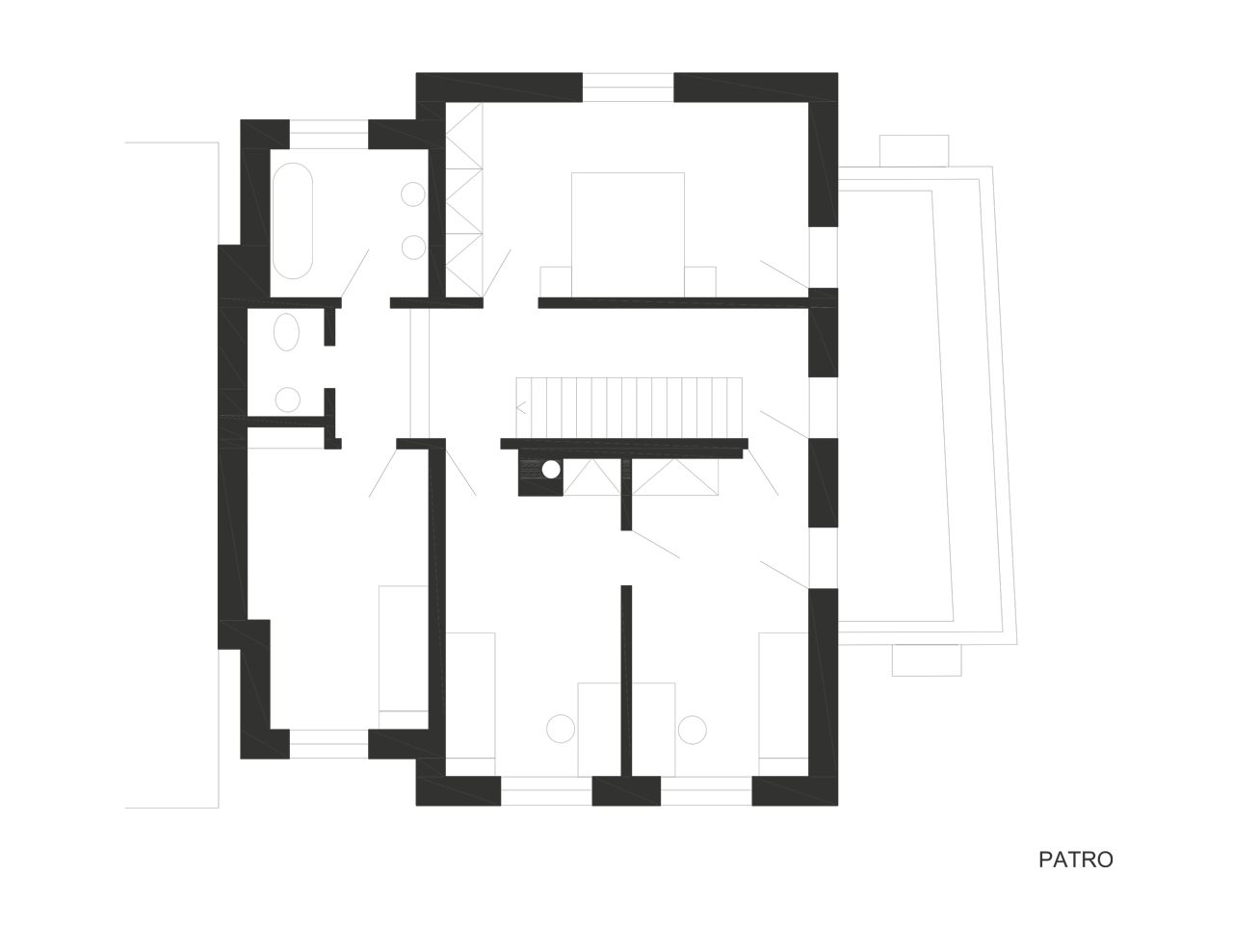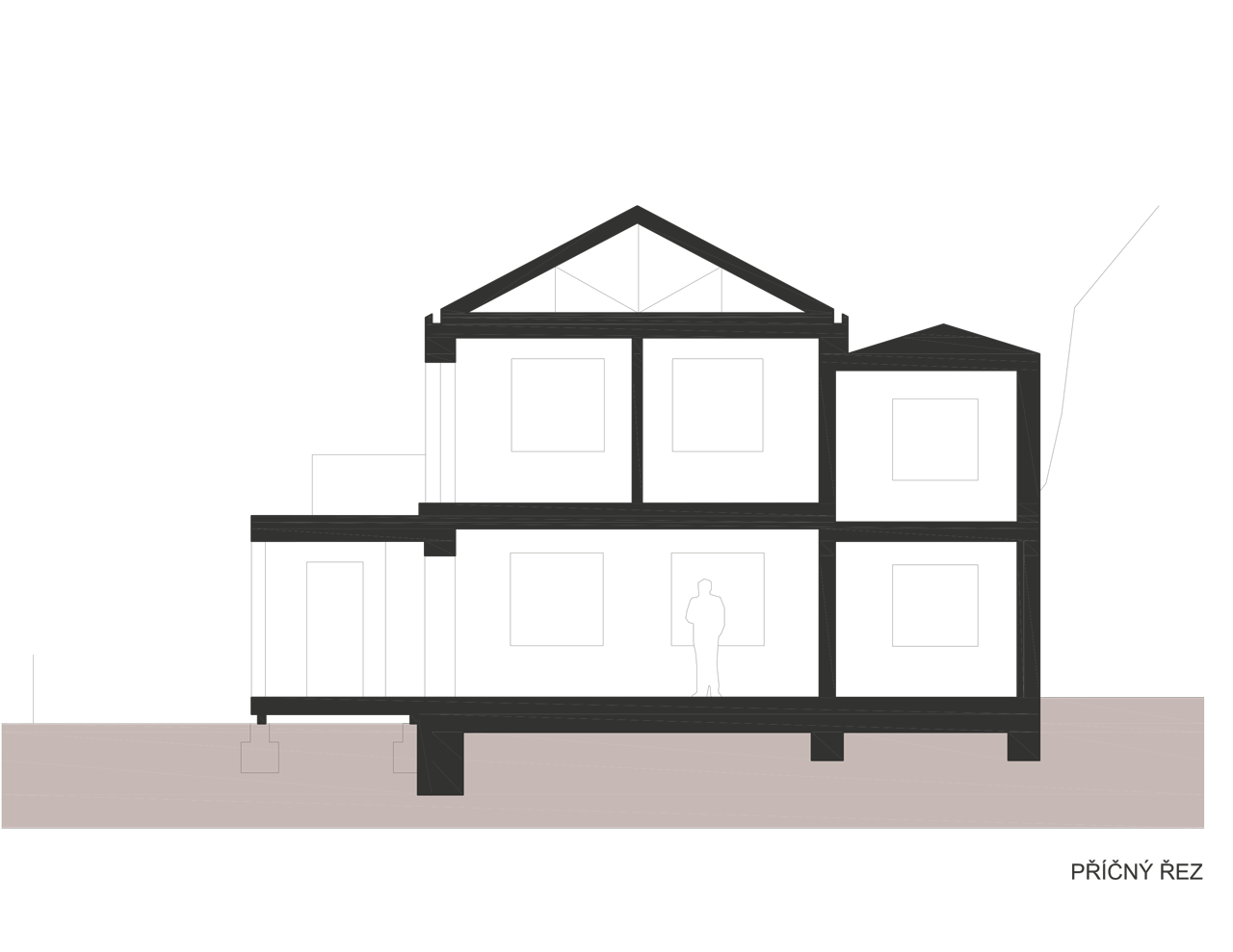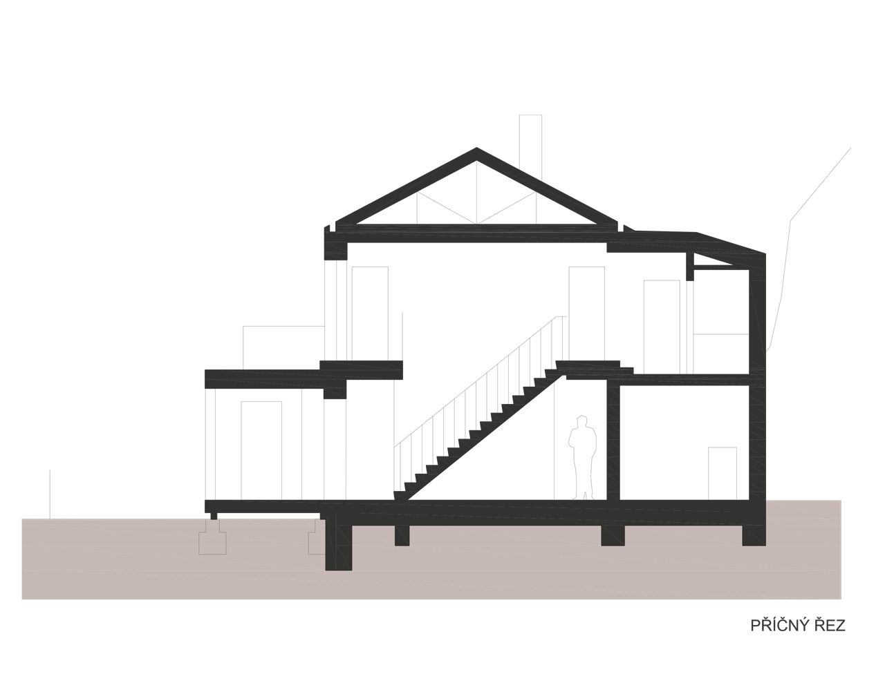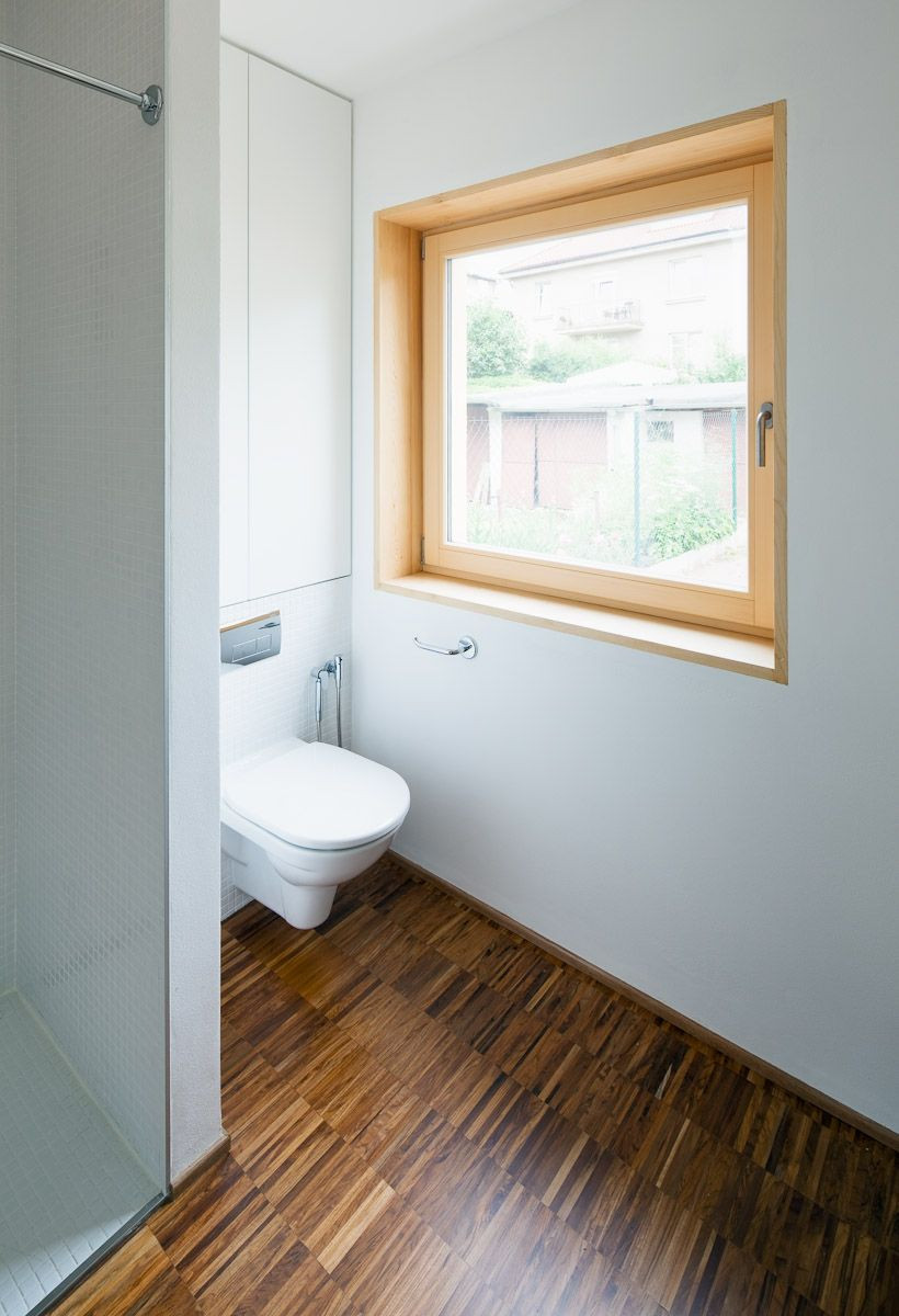 Do domu i na zahradu se vstupuje přes verandu, která je pojata jako lehká dřevostavba s pochozí střechou. Vnitřní dispozice vychází z plánu rekonstrukce a maximálně využívá omezený prostor pro potřeby rodinného bydlení. Propojením místností v přízemí vzniká otevřený obytný prostor, v patře jsou malé, ale funkční a světlé pokoje. Koupelny jsou umístěny v krčku. Schodiště je prefabrikovaný betonový monolit.