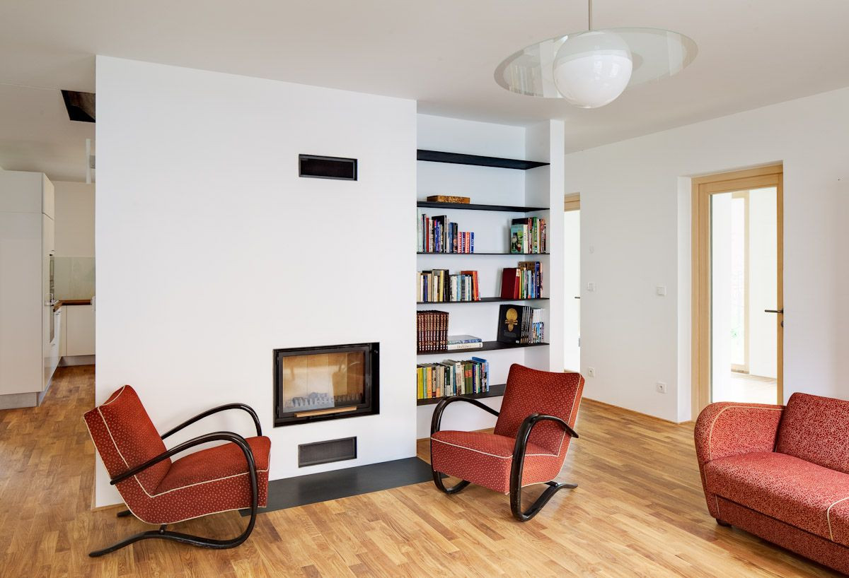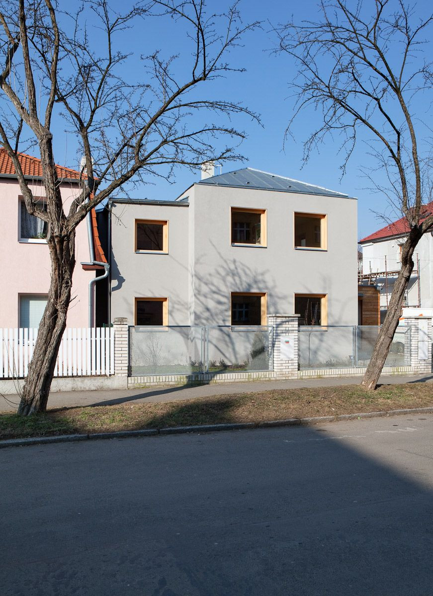 Původně plánovaná rekonstrukce strašnického dvojdomku ze 20. let minulého století se během stavby změnila na stavbu nového domu. Důvodem byl špatný technický stav starého zdiva, který počáteční průzkumy neodhalily. Návrh novostavby bylo nutné držet v obrysech daných stavebním povolením na rekonstrukci.