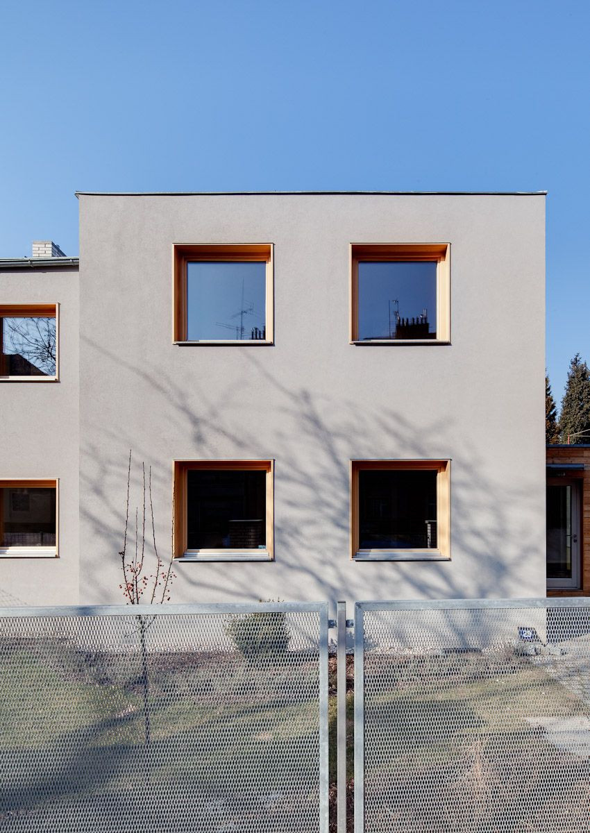 Dům navazuje na typickou původní zástavbu a podobu dvojdomků v okolní kolonii členěním na hlavní hmotu a spojovací krček. Jedná se o dva jednoduché omítnuté objemy se čtvercovými okny, kdy jeden je zmenšeným obrazem druhého (jako rodič a dítě). Okna jsou lemována dřevěným ostěním, střecha je z titanzinkového plechu.