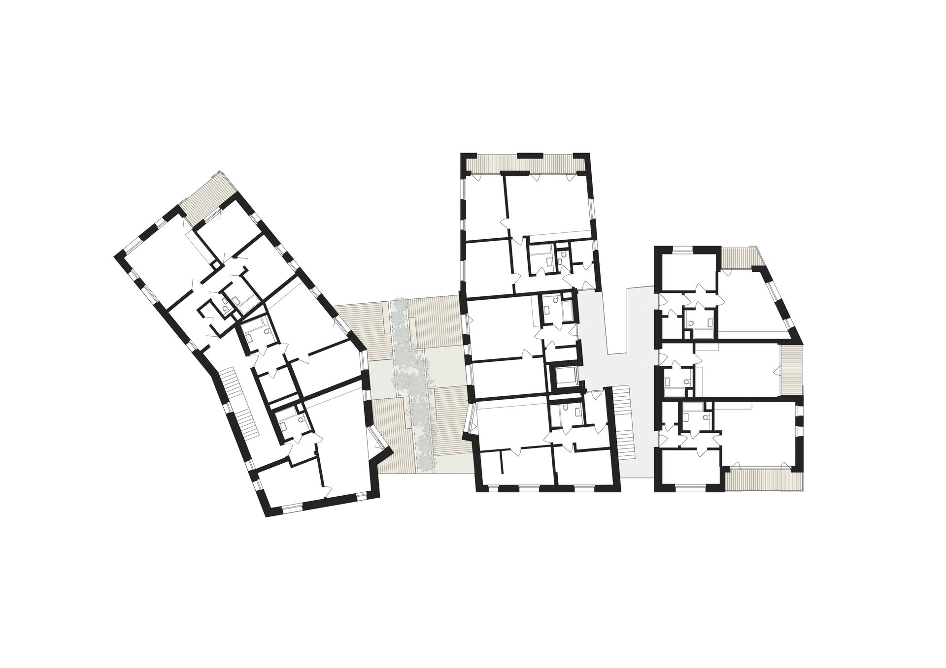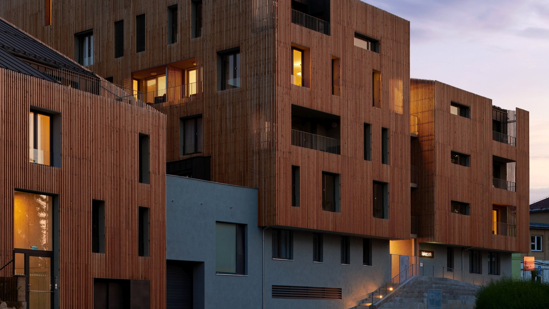 Fasády objektu propisují základní výtvarný a funkční koncept domu – stěny s okenními otvory jsou doplněné nikami pro lodžie. Okenní otvory jsou navrženy ve vertikální proporci a zajišťují dostatečné proslunění a prosvětlení vnitřních ploch obytných místností; díky nízkému parapetu umožňují vyšší kontakt s venkovním prostorem. Obklad pláště dřevěnými hranoly odkazuje k přírodním kvalitám lokality a na fasádách vytváří kombinaci otevřených ploch – okenních otvorů a lodžií – a plných částí. Dřevěné hranoly obkladu na vybraných místech předstupují před lodžie a terasy, čímž vytvářejí subtilní sluneční clonu a oddělují chráněné soukromé prostory od okolí. Dispoziční řešení vnitřních prostorů je racionální a efektivní; v objektu jsou umístěny bytové jednotky různých velikostí navržené s důrazem na proslunění každého bytu a využití výhledů do okolí. K většině bytových jednotek přísluší lodžie nebo terasa umožňující svou plochou umístění jídelního stolu.