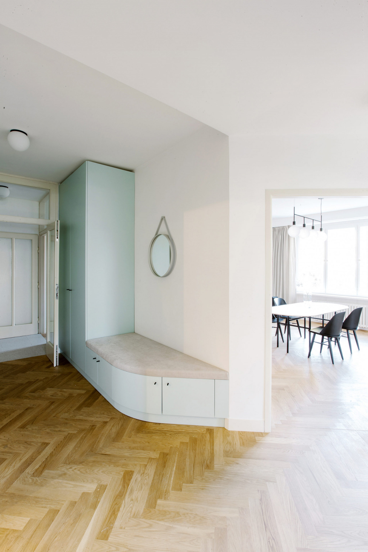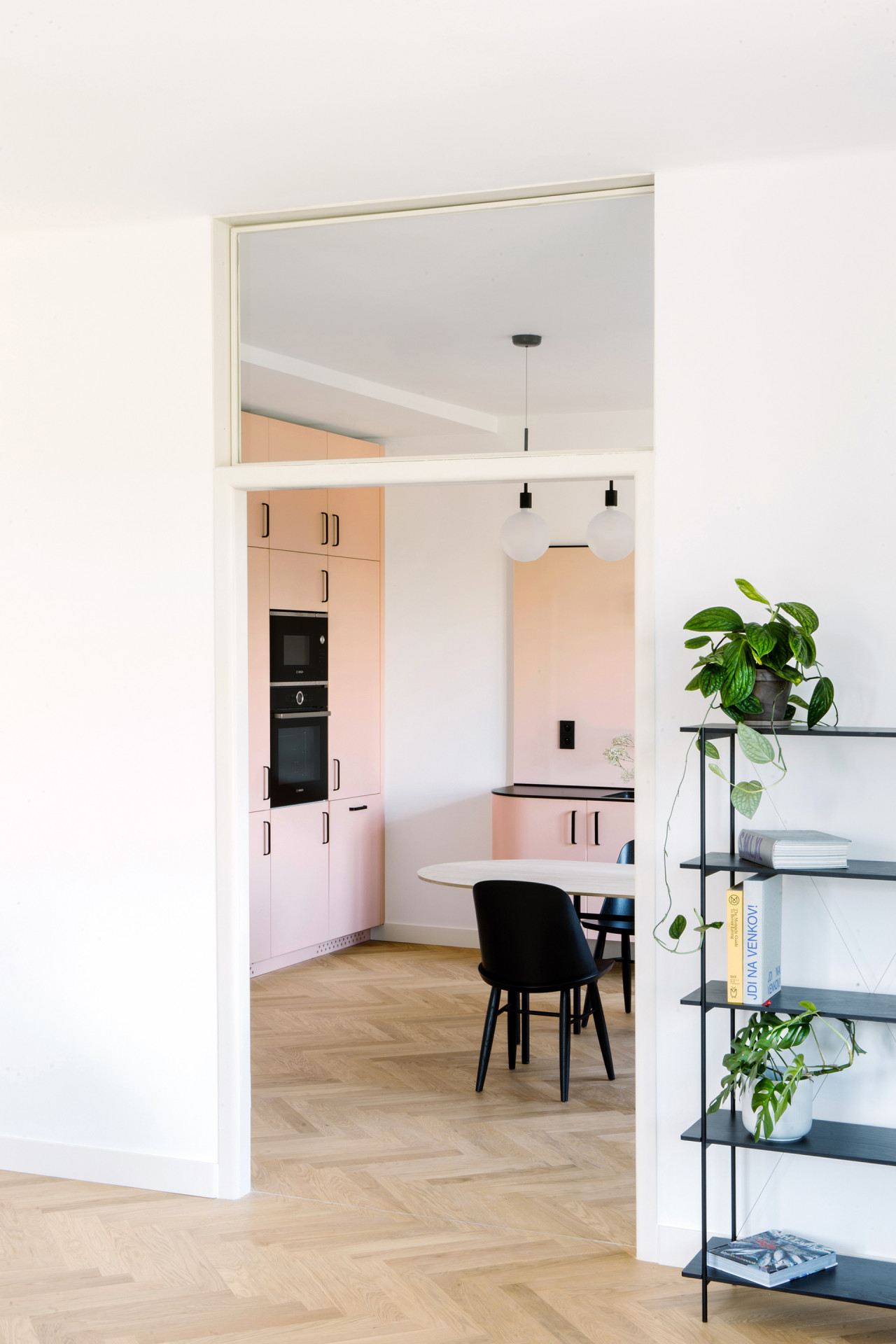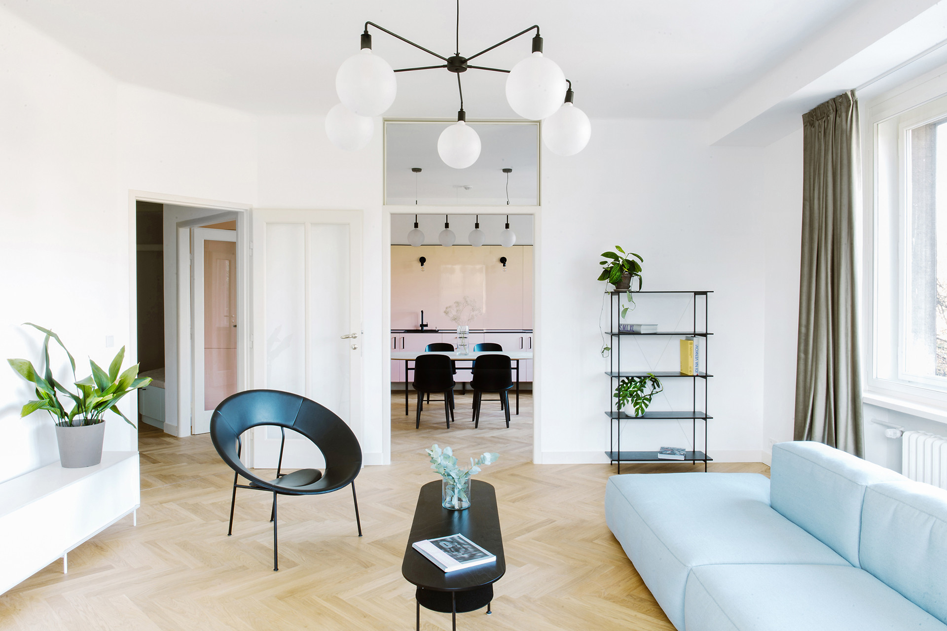 Středobodem bytu se tak stává obytný prostor velkoryse propojený s kuchyní a jídelnou pomocí původních dvoukřídlých dveří s přidaným nadsvětlíkem.