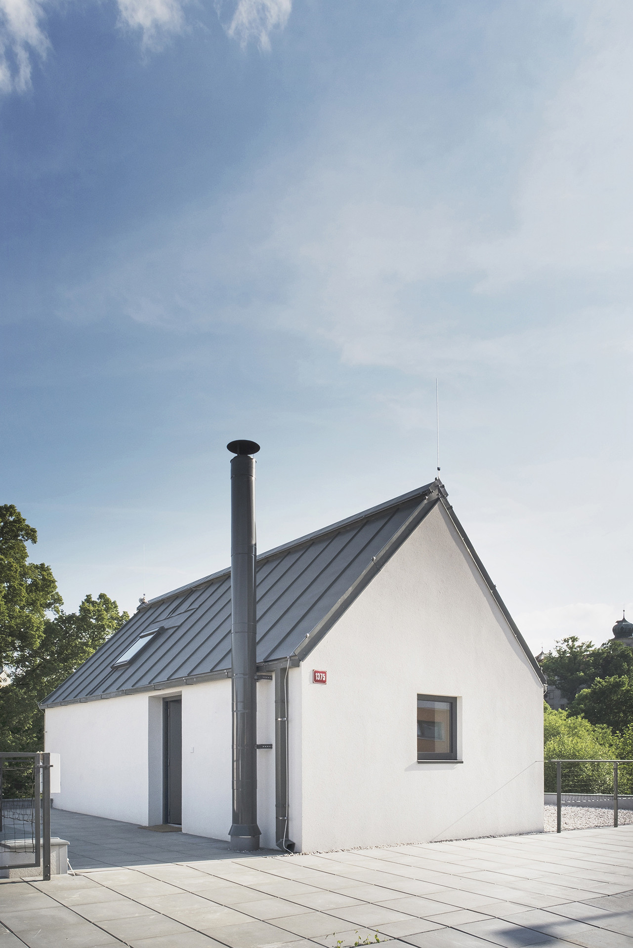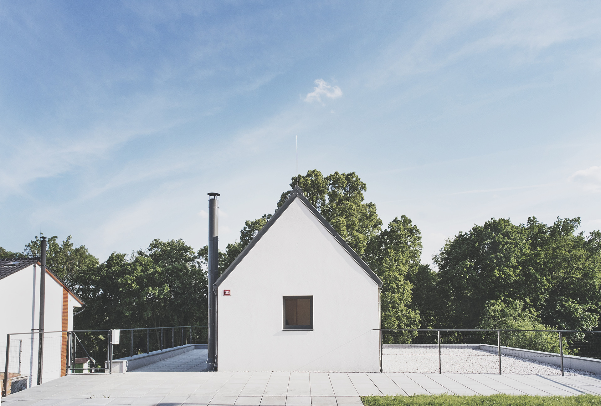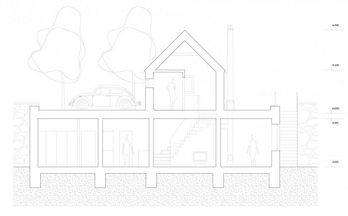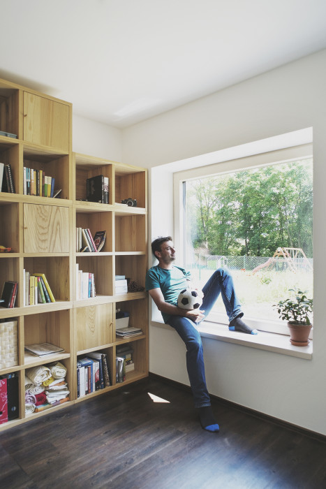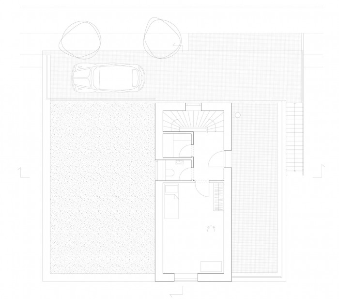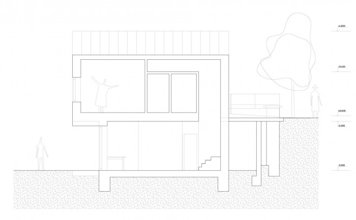 Jakým způsobem se vypořádat s rozdílem výškových úrovní komunikace a pozemku a s regulativem vyžadujícím sedlovou střechu? Jakým způsobem navrhnout dům s maximálním kontaktem se zahradou? Klienti si přáli malý dům s velkou zahradou v Mníšku pod Brdy. Navrhli jsme dvoupodlažní objekt situovaný na severní hranu pozemku, kde je většina obytné plochy umístěna ve spodním podlaží v přímém kontaktu s terasou a zelení. Terasa je kryta přesahem střechy, který zároveň stíní převážnou část jižní fasády. Nahoře, v domečku se sedlovou střechou, se nachází vstupní část a jedna obytná místnost orientovaná na jih do zahrady. Výhledům dominuje mohutná památná lípa u potoka na jihu pozemku.