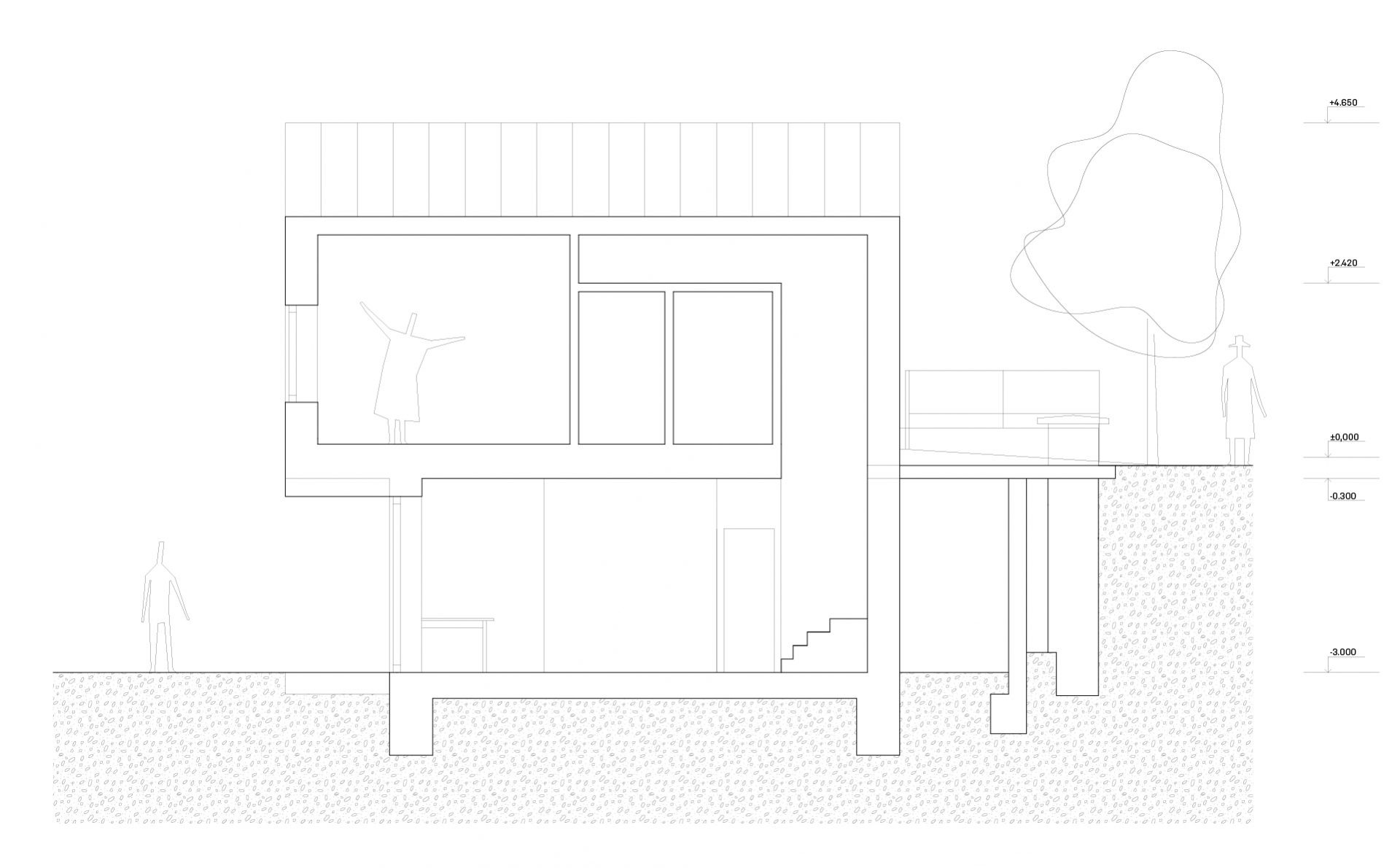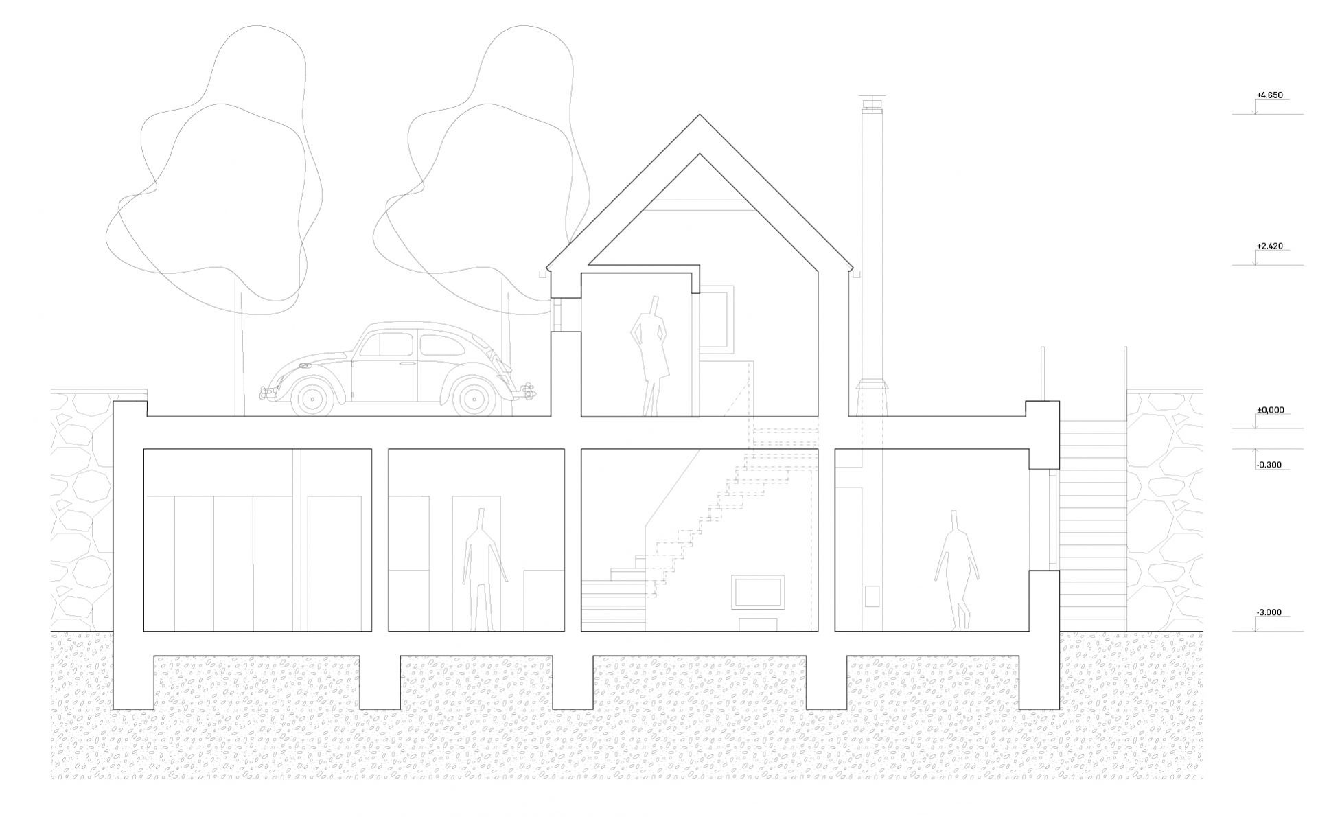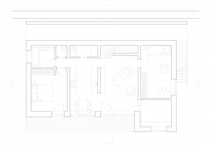 Jakým způsobem se vypořádat s rozdílem výškových úrovní komunikace a pozemku a s regulativem vyžadujícím sedlovou střechu? Jakým způsobem navrhnout dům s maximálním kontaktem se zahradou? Klienti si přáli malý dům s velkou zahradou v Mníšku pod Brdy. Navrhli jsme dvoupodlažní objekt situovaný na severní hranu pozemku, kde je většina obytné plochy umístěna ve spodním podlaží v přímém kontaktu s terasou a zelení. Terasa je kryta přesahem střechy, který zároveň stíní převážnou část jižní fasády. Nahoře, v domečku se sedlovou střechou, se nachází vstupní část a jedna obytná místnost orientovaná na jih do zahrady. Výhledům dominuje mohutná památná lípa u potoka na jihu pozemku.