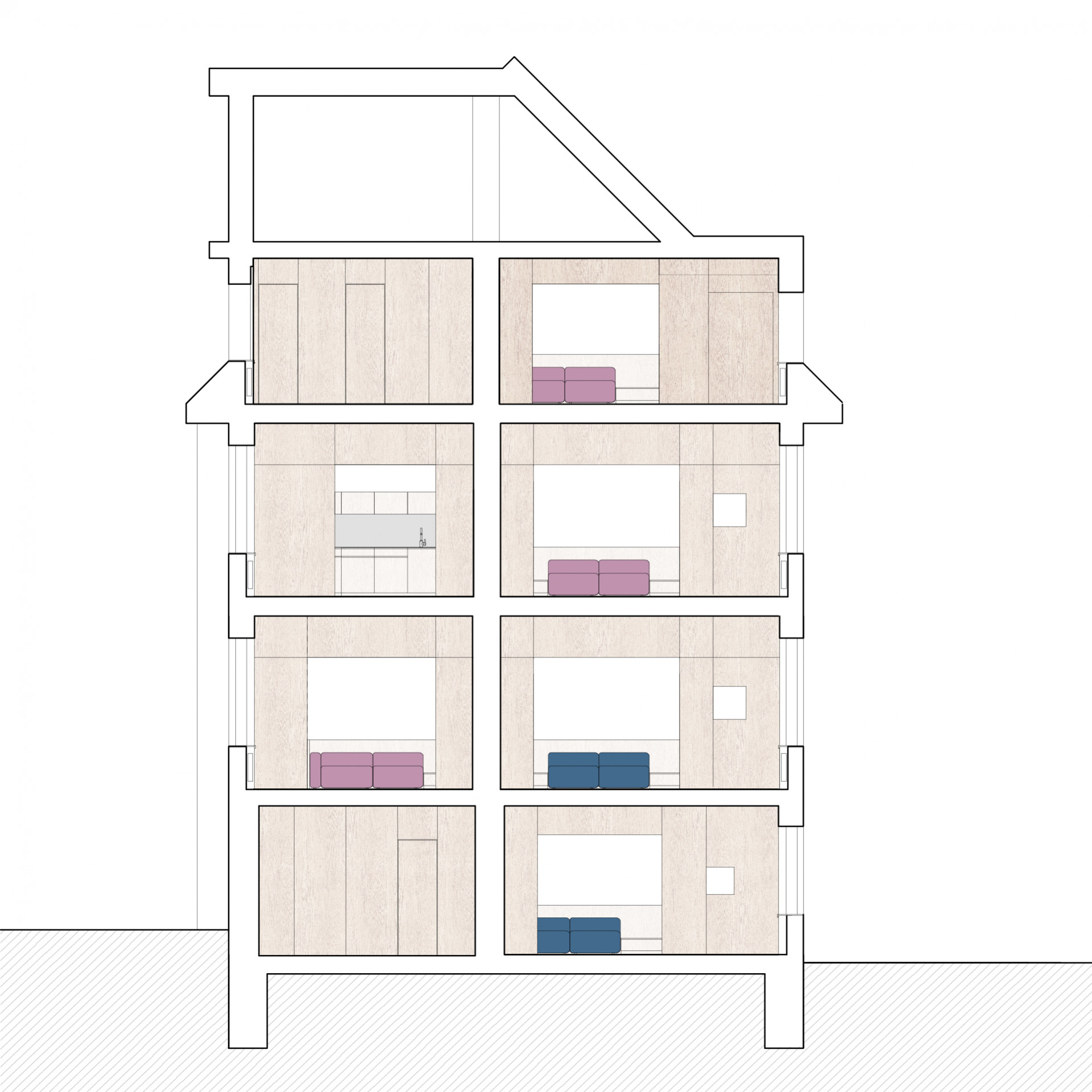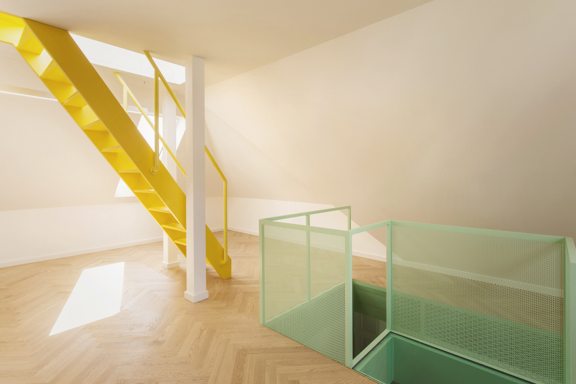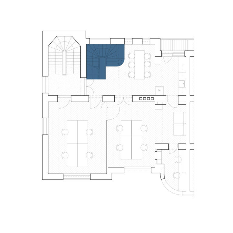 Podlaží 1-4; zónování pater – 2 dřevem obložené stěny od suterénu po podkroví, obnova historických detailů, repase dveří, barevnost světlého dubu a bílé barvy‚ modré, zelené, žluté a červené schody.