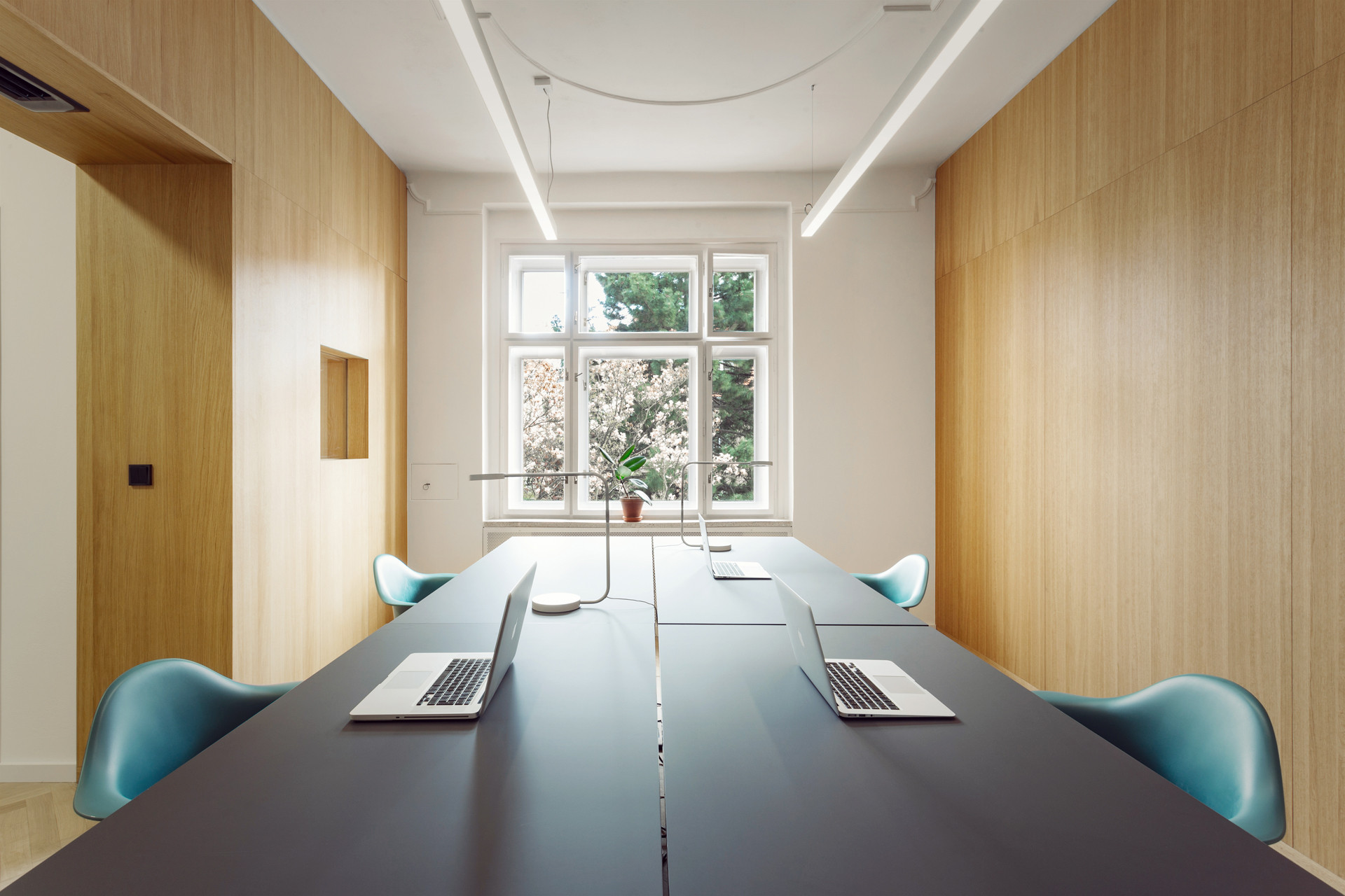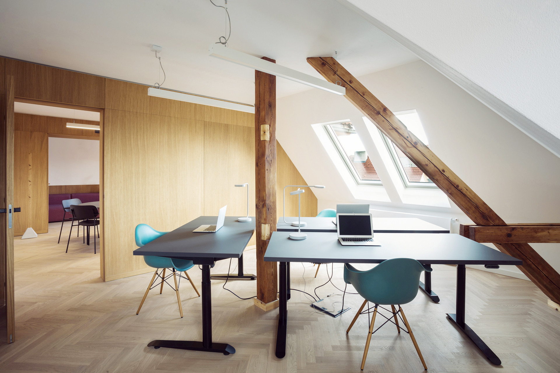 V každém patře 4+4=8 zaměstnanců, práce ve velkých a světlých místnostech, 1 pokoj k setkávání v menších místnostech.