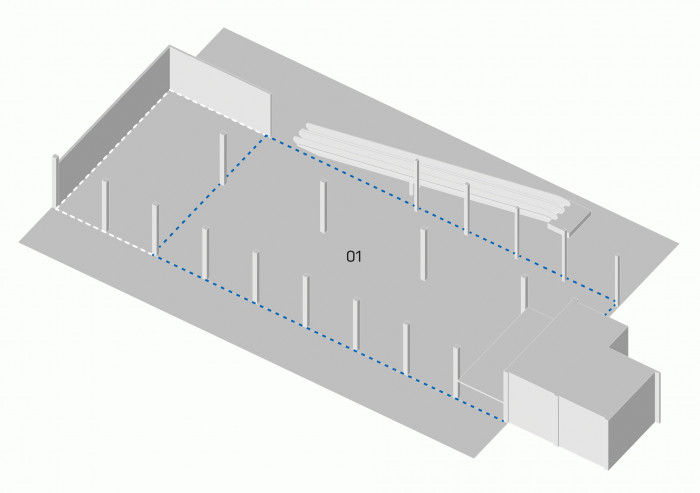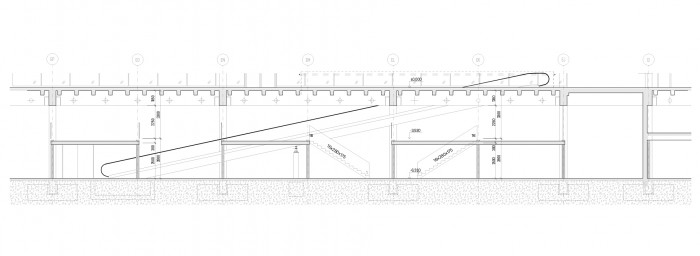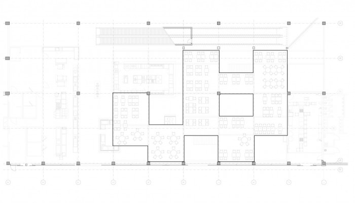 Rozhodli jsme se proto vložit do haly druhé podlaží, kterým jsme znásobili plochu pro sezení hostů. V celém prostoru restaurace je vložen ocelový skelet ve stejném rastru a se stejnou výškou. Do jednotlivých polí rastru jsou následně vsazeny konstrukce vloženého patra. Tím vznikají plná a prázdná pole rastru. Jejich vzájemnou kompozicí vytváříme v interiéru různé nálady v závislosti na typu prostoru. V částech, kde je předpokládaný hlavní pohyb lidí jsou prázdná pole, která umožňují průhledy do výšku a do dálky, co ulehčuje orientaci v prostoru. V místech, kde se předpokládá zejména sezení hostů, jsou pole plná, která vytvářejí sníženým stropem příjemnou atmosféru pro stolovaní s vhodným osvětlením. Orientaci hostů ale i kontrolu směrů pohybu umožňují vložené nábytkové kusy s výškou 1m, které tvoří snížené paravány.