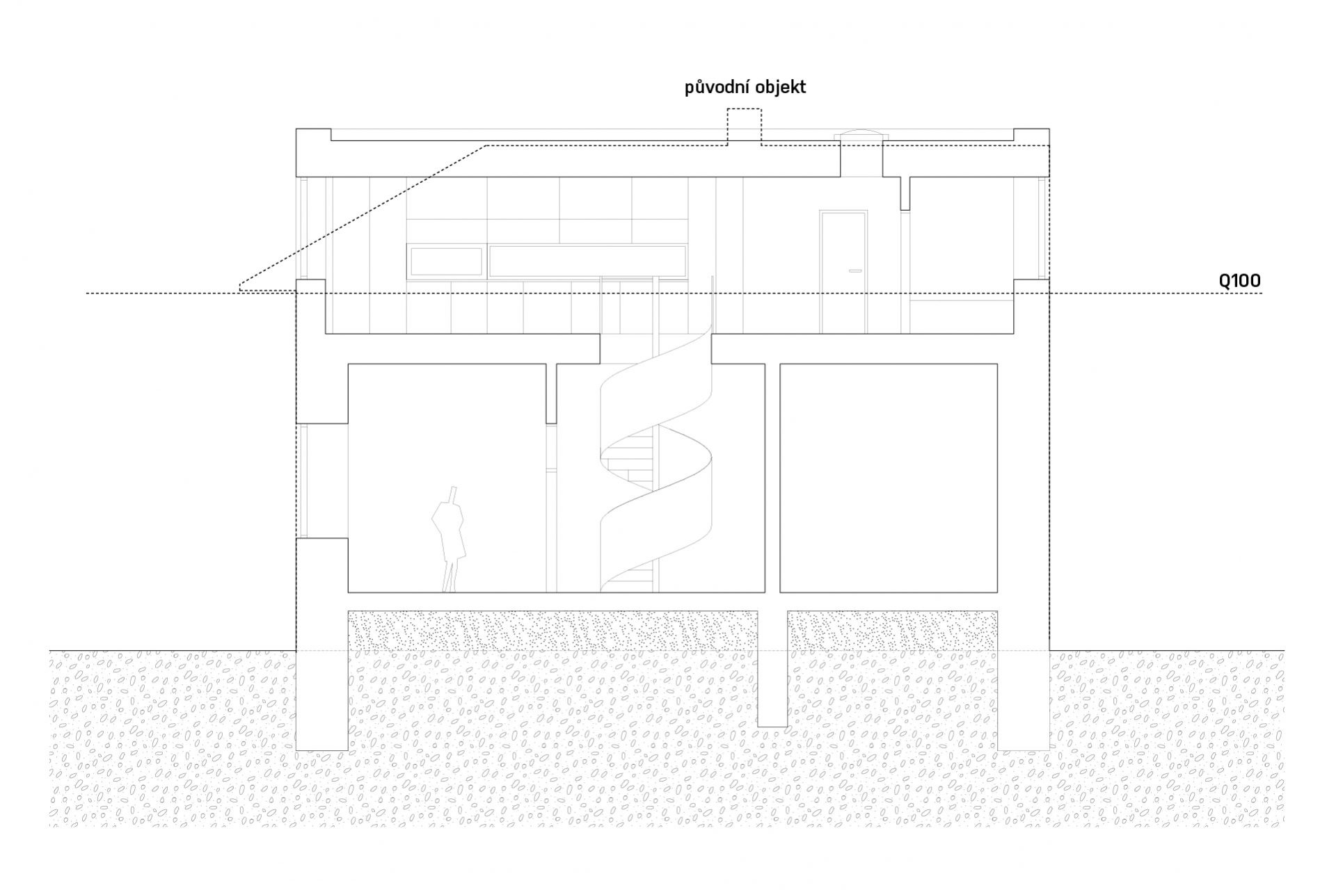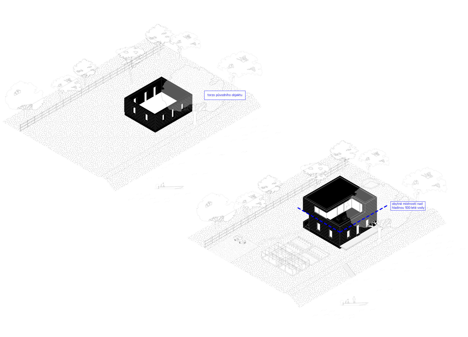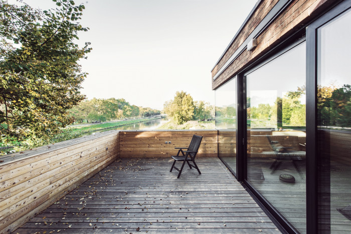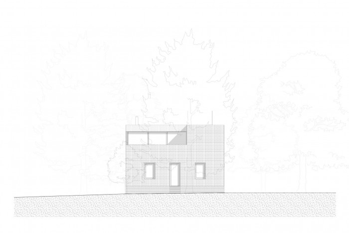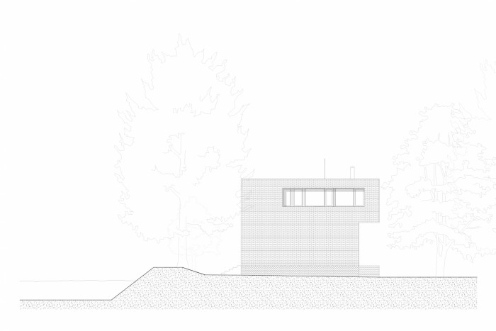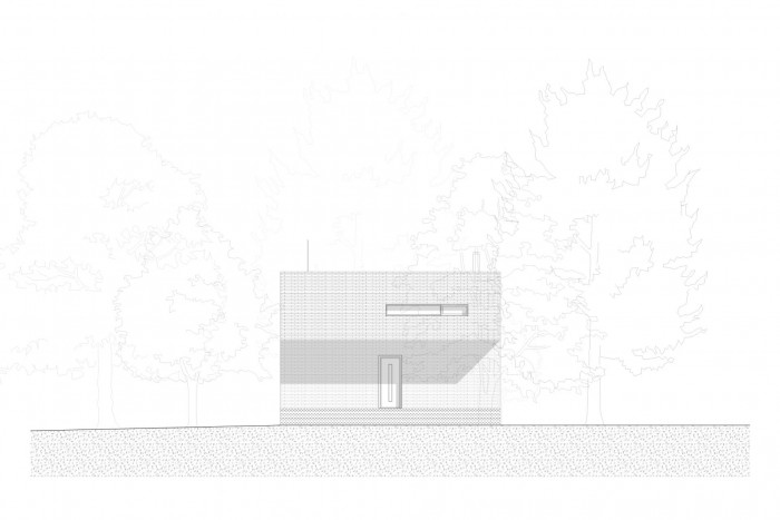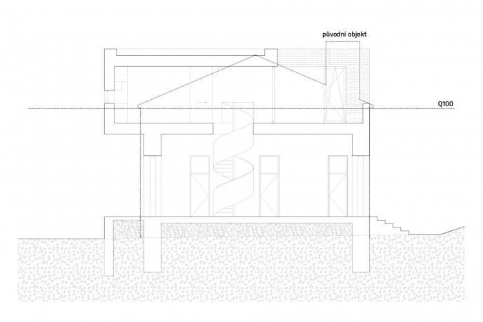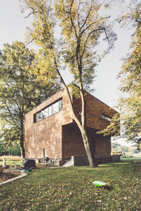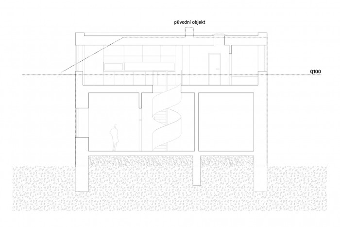 Původní strážní domek Rakousko-uherské armády na Císařském ostrově stál nevyužívaný mezi stromy bez povšimnutí několik desetiletí. Z původního objektu se zachovalo pouze masivní torzo z pohledových, ostře pálených cihel takzvaných “zvonivek”. Objekt je umístěn v záplavové zóně a už jeho původní založení tomu odpovídalo. Návrh přidává na odhalenou korunu stávajících obvodových zdí nový betonový objem, který v sobě absorbuje všechny hlavní obytné místnosti již ve výšce nad úrovní stoleté vody. Připomenutím původního objektu je materiálové sjednocení obou pater do masivního artefaktu z pohledových cihel.