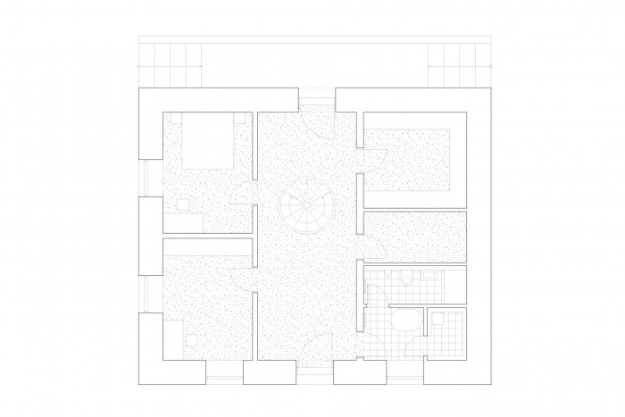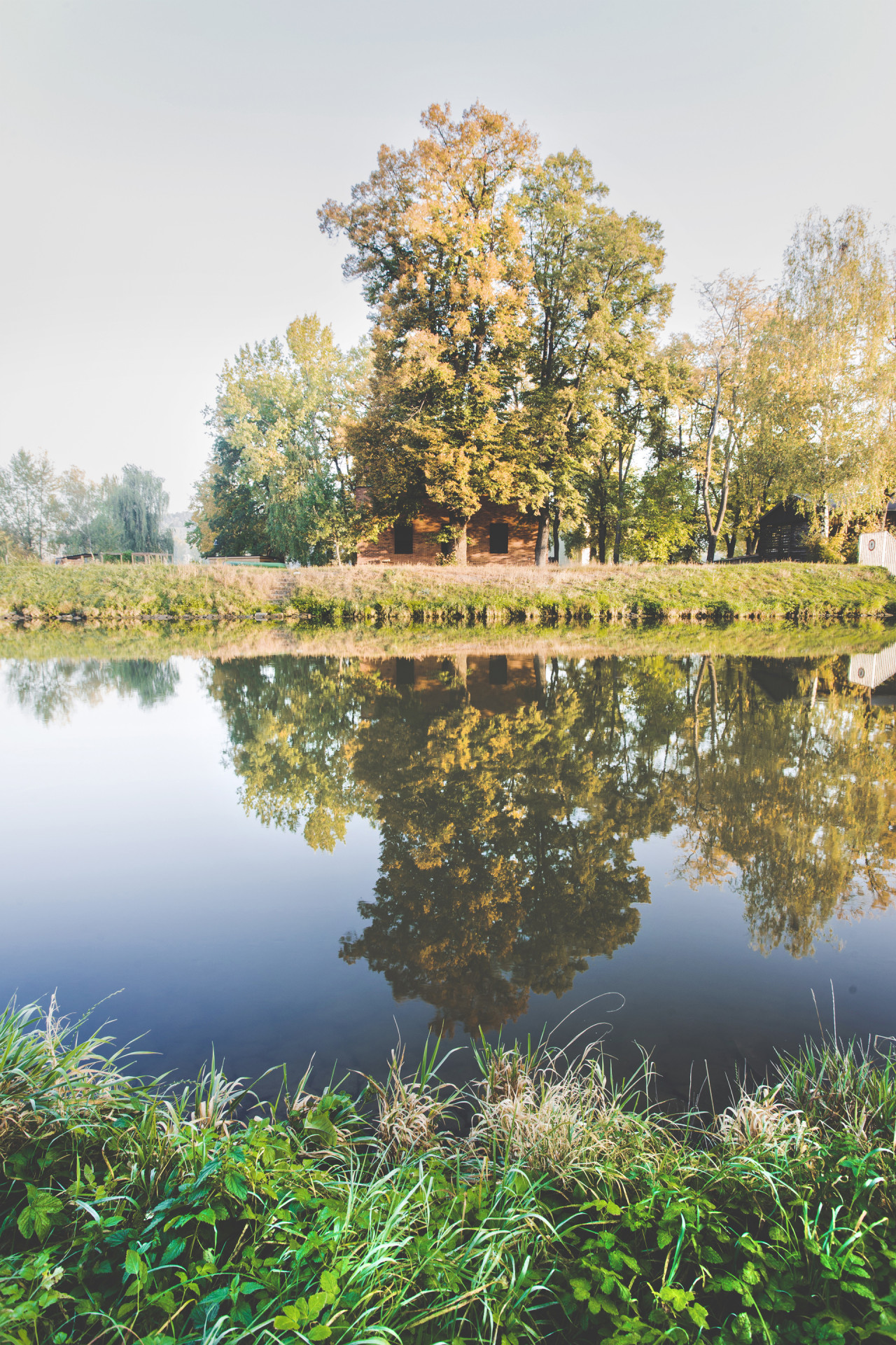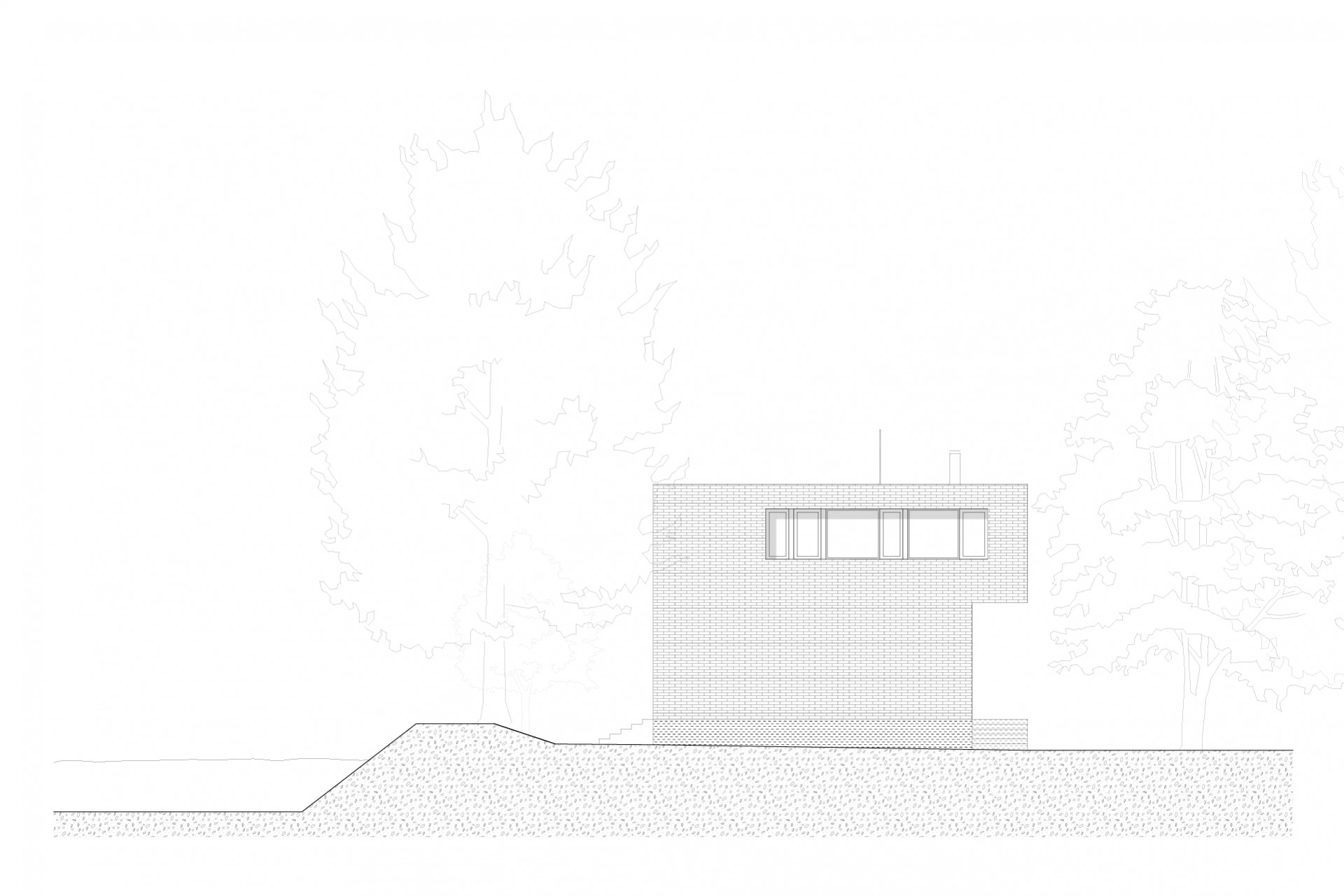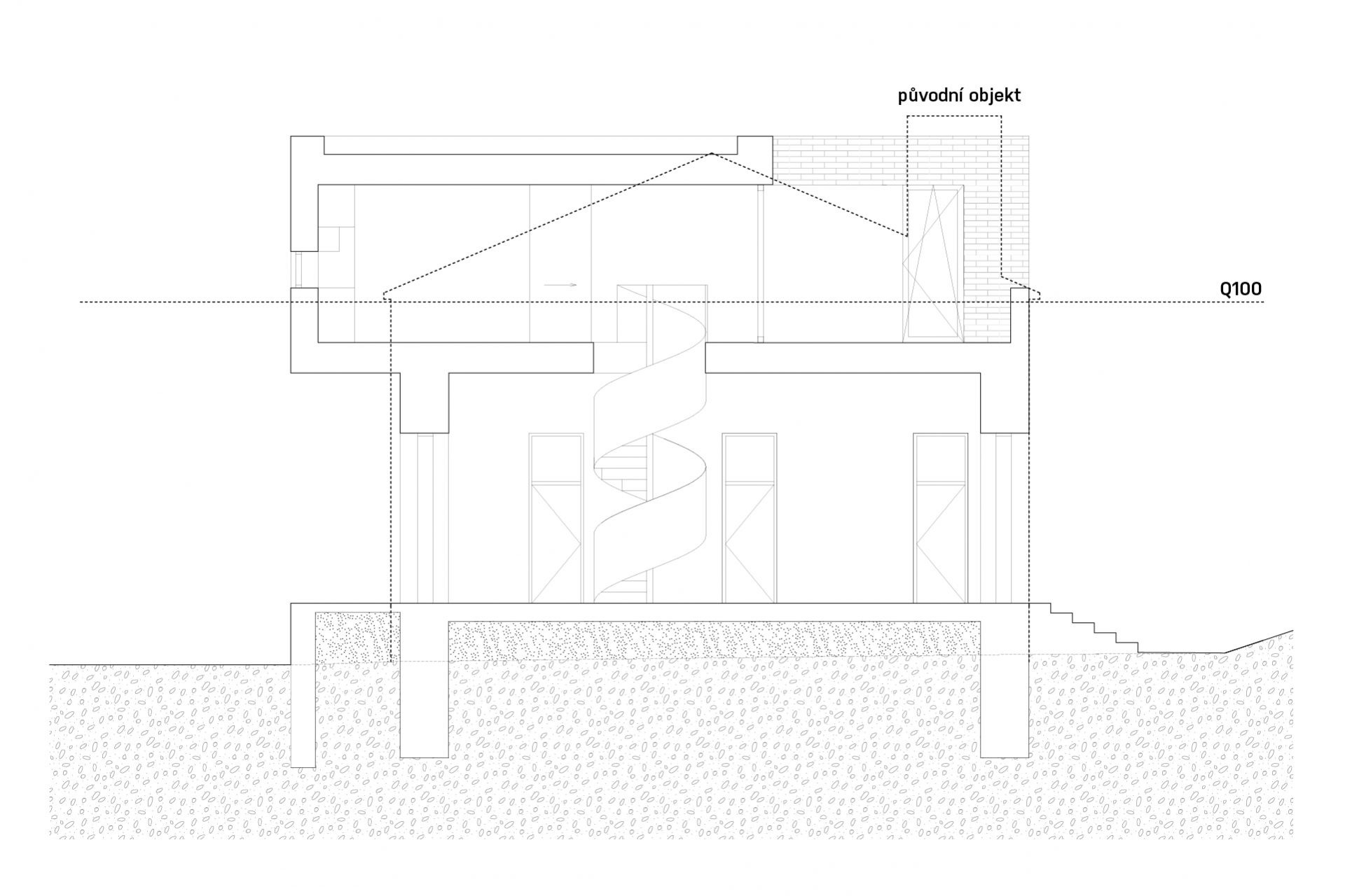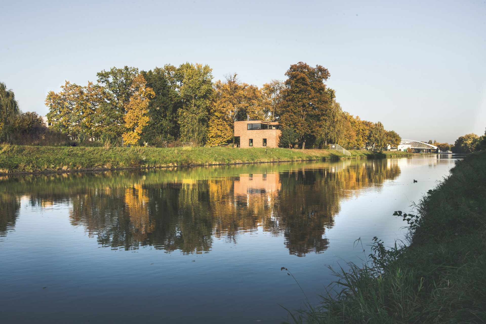 Původní strážní domek Rakousko-uherské armády na Císařském ostrově stál nevyužívaný mezi stromy bez povšimnutí několik desetiletí. Z původního objektu se zachovalo pouze masivní torzo z pohledových, ostře pálených cihel takzvaných “zvonivek”. Objekt je umístěn v záplavové zóně a už jeho původní založení tomu odpovídalo. Návrh přidává na odhalenou korunu stávajících obvodových zdí nový betonový objem, který v sobě absorbuje všechny hlavní obytné místnosti již ve výšce nad úrovní stoleté vody. Připomenutím původního objektu je materiálové sjednocení obou pater do masivního artefaktu z pohledových cihel.