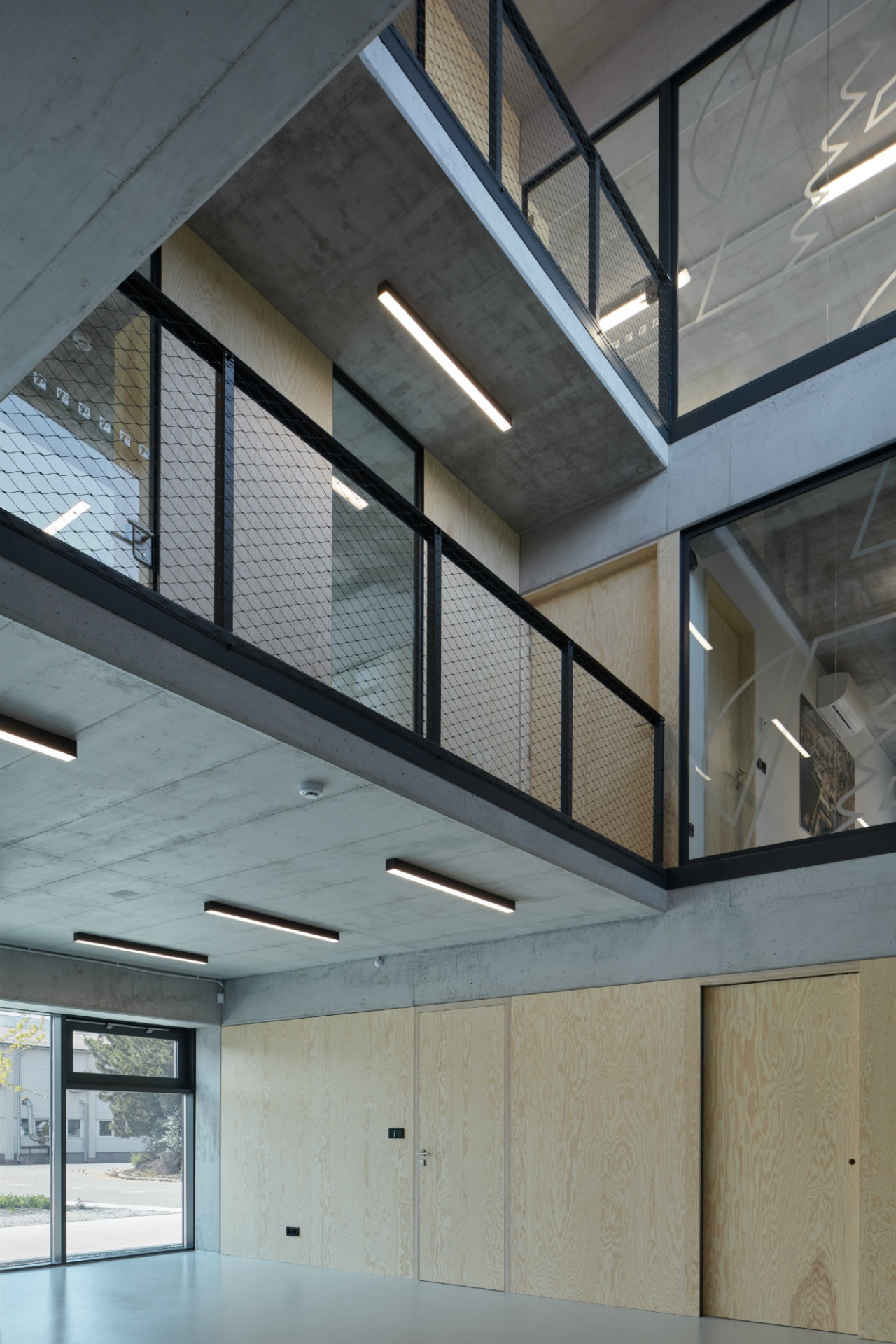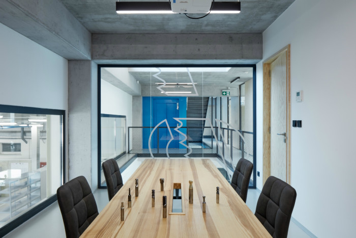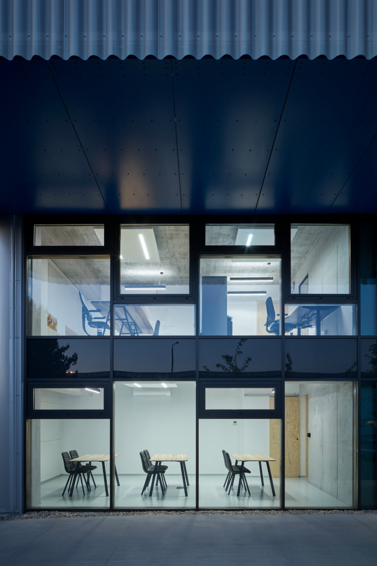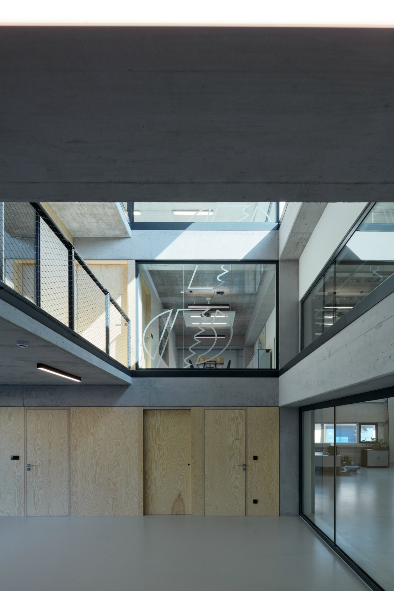 Třípodlažní budova administrativy je monolitickým betonovým skeletem, který je přiznaný v interiéru. Jednotlivé kanceláře mají svým rozměrem a nízkou světelnou výškou blíže pokojům v rodinných domech než v rozlehlých openspace. Důležitým komunikačním prvkem uvnitř objektu je malé zastřešené atrium, jímž proniká světlo. Stěny halové i administrativní části jsou ve velké míře transparentní, jen výtahová šachta a vstup do domu je zvýrazněný modrou firemní barvou. Z jedné budovy je možné vidět do druhé a naopak, průhled na pracující firmu funguje také z exteriéru. Návštěvník vidí pohyb v budovách a naopak zaměstnanci vidí na přicházející. V atriu jsou ochozy fungující jako místo setkávání a zároveň cesta na zelenou střechu, ze které je vidět až na Hostýnské vrchy.