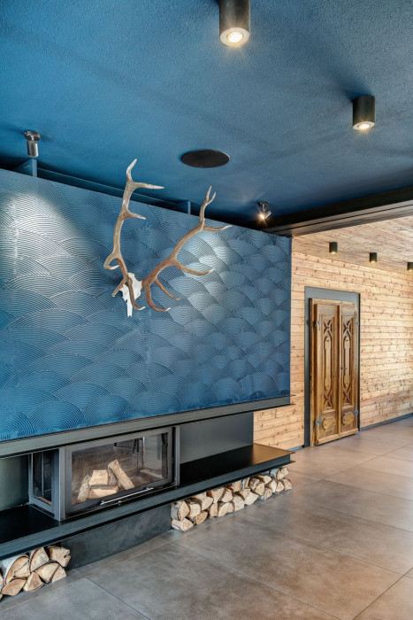 Celý interiér dolaďují detaily v podobě použitých prvků nebo materiálů. Drátěné lustry s industriálním charakterem, tmavě modrá barva indigo na vlnitém štuku, bar obložený místní žulou, paroží nad krbem jako šperk. Provedené zásahy se snaží reflektovat místo i dobu svého vzniku.