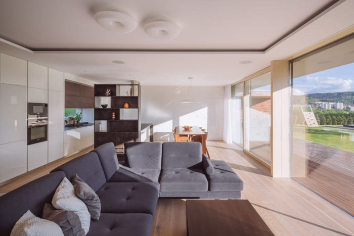 Všechny obytné místnosti domu jsou orientovány na jihozápad a mají přímou návaznost na průběžnou lodžii - obrazovku, která rozšiřuje užitnou plochu místností o příjemný venkovní prostor k posezení.