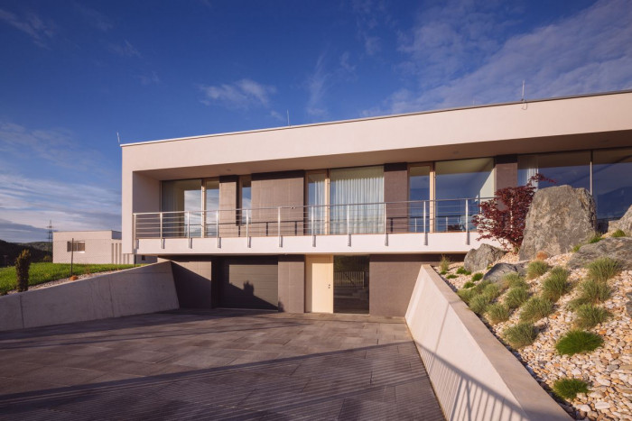 Otevřenost klienta, fascinace výhledem a maximální efektivita využití prostoru. Tyto výchozí aspekty daly vzniknout elegantnímu konceptu domu – obrazovky shlížející do údolí. Výrazná elementární hmota objektu – obrazovka – přisazená při horní hraně svahu vymezuje dvě úrovně prostoru – veřejného a privátního. Toto uspořádání, kdy dům je umístěn až v zadní části pozemku, umožňuje vytvořit jedinečnou situaci - stavbu otevřít do zahrady s průhledem dále do údolí Zlína na jejím pozadí. Privátní část pozemku není vymezena tradičním způsobem – samotným domem, avšak je definována výškovým rozdílem terénu mezi ulicí a zahradou a v kombinaci s osazenou zelení poskytuje dostatečný pocit soukromí. Do ulice se potom suterén domu otevírá dynamicky se rozšiřujícím zářezem do terénu – vstupem a vjezdem vítajícím uživatele domu. Vstupní část je další významnou částí kompozice návrhu.