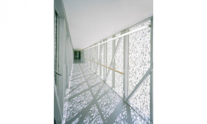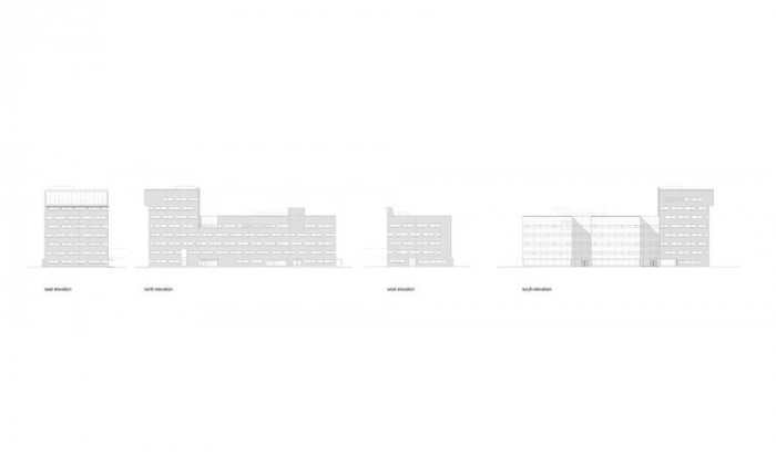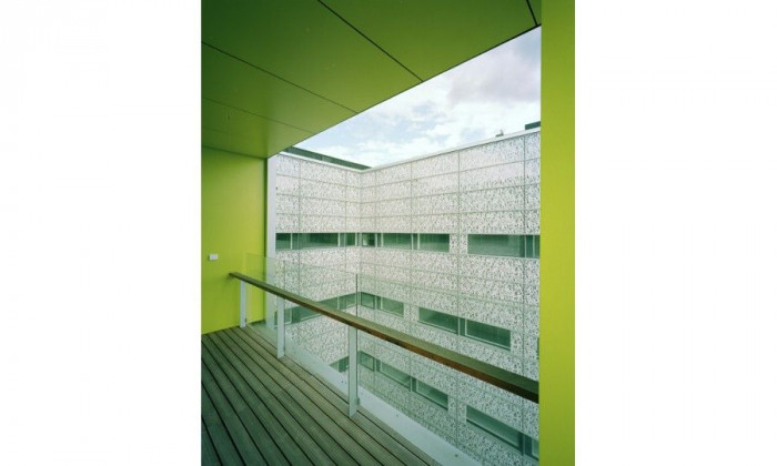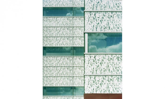 Využití vzorovaného skla a položení cihel bylo zvoleno kvůli dlouhé trvanlivosti a odolnosti. Přesná struktura budovy je obložena tmavě červenými, ručně vyrobenými cihlami na osmipatrové jednotce a východní fasádě; vzorované sklo tvoří západní stěnu a stěny kolem vchodu, zatímco vstupní cesty a podlahu v přízemí pokrývá malba v jasných barvách.