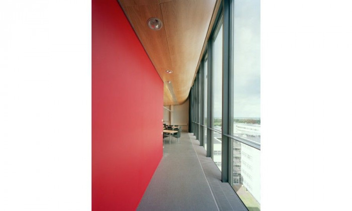 Koncept celého prostoru je založen hlavně na tom, aby šlo každé patro flexibilně variovat podle jednotlivých potřeb společností. V přízemí je situován hlavní vchod a společné prostory, jako je kavárna a otevřené prostory pro setkávání. Interiér je vybaven čistě a jednoduše, místně prosvícen a zpestřen vertikálními červenými předěly.