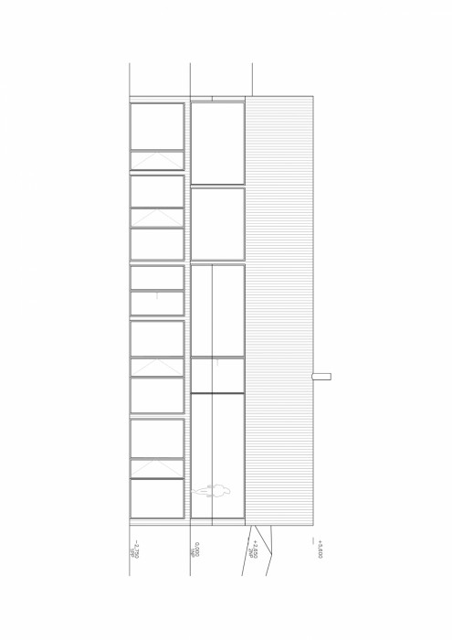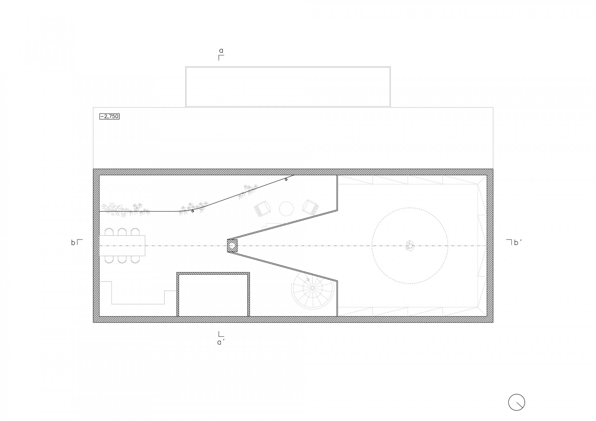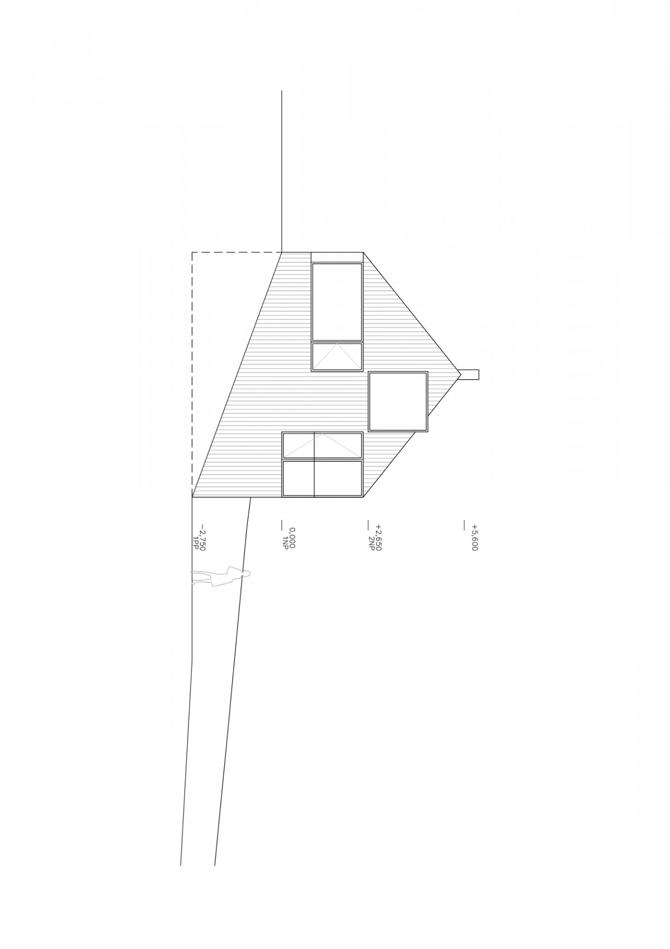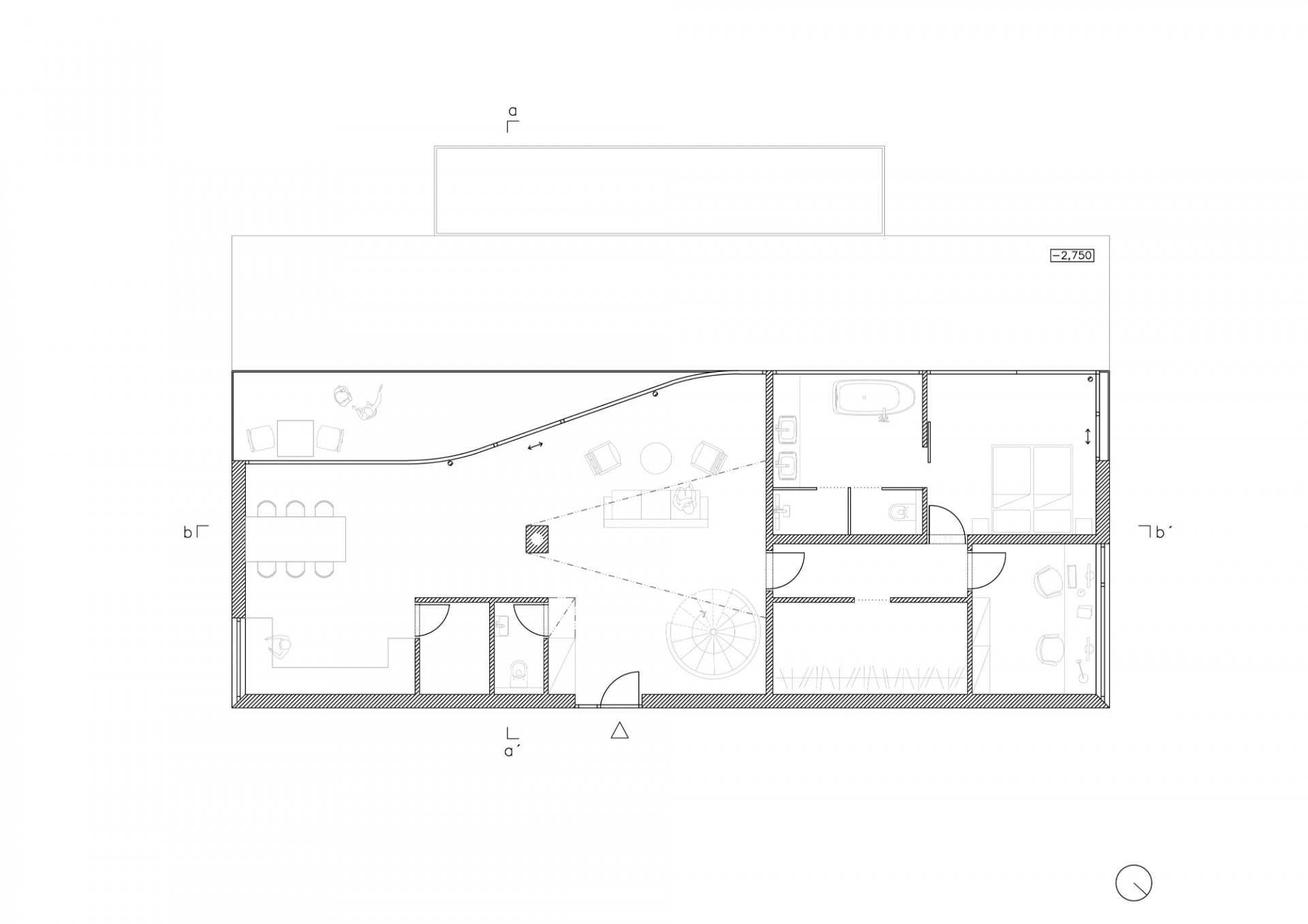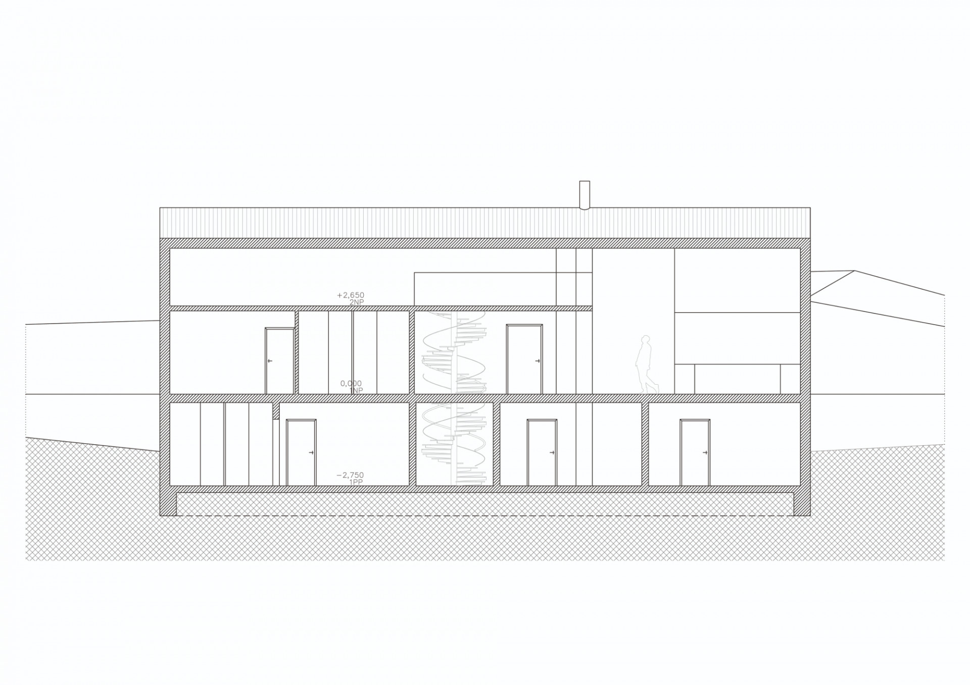 Dům je uložen do svažitého terénu tak, že suterén má nástup ze spodní strany směrem k venkovnímu bazénu. Hlavní vstup a příjezd je pak orientován do 1NP v horní části pozemku. Celý suterén je ze železobetonu. Od úrovně ± 0,0 je objekt čistou dřevostavbou. Krov je tvořen čtyřmi rámy – lepenými plnými vazbami, do nichž je bílý pohled dotvořen třemi páry konvexně prohnutých polštářů pro lepší využití prostoru, akustickou pohodu a světelnou režii.