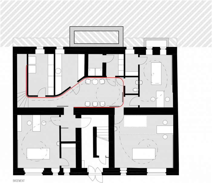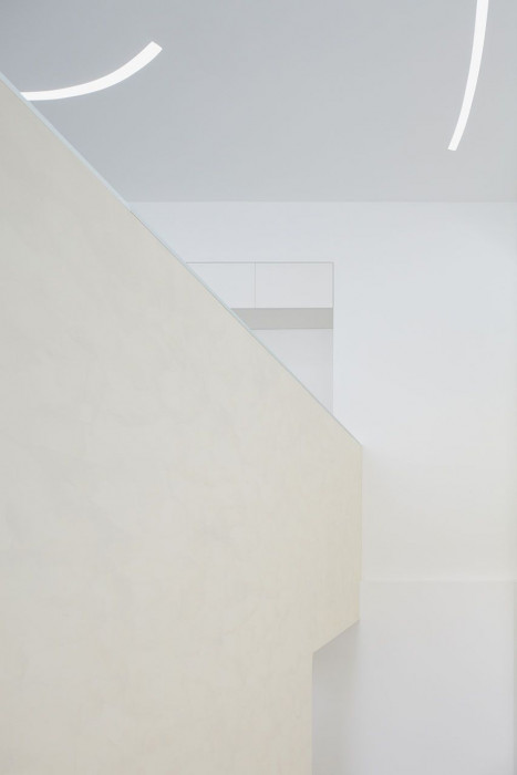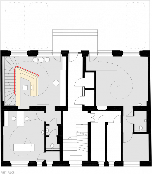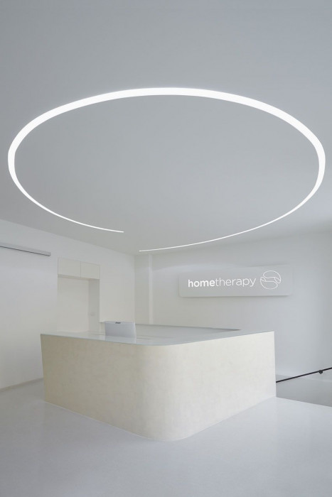 Pro pochroumaná těla a tedy fyzioterapii obecně je podstatné držení páteře, jejíž motiv je v logu firmy Hometherapy. Hledali jsme způsob, jak tento motiv využít v návrhu interiéru. Podél nových schodů do suterénu se vine stěna v barvě kosti, pomyslná páteř na kterou navazují všechny prostory. Zeď přechází z recepčního pultu v přízemí do sklepa, kde se zatočí v čekárně.