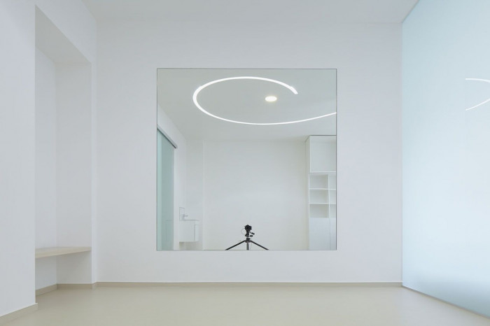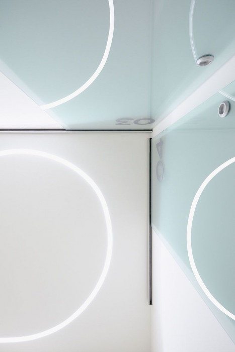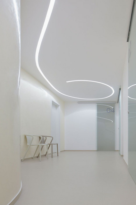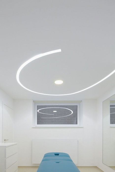 Na stěnu - páteř jsou navěšeny jednotlivé místnosti. Pohyb podél stěny kopíruje světelná linka. Ordinace drží motiv světelné linky, která zobrazuje kroužení kolem neuralgického bodu a také kroužení nad zdravotnickým lehátkem.