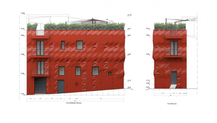 Genius loci území, po desetiletích spící, se nakonec probudil. Fasády začaly vibrovat a díky své struktuře vyvolávají dojem stále se pohybujícího povrchu.Červená barva má nejdelší vlnovou délku viditelného spektra a její odstíny mohou být spojeny s nejdelšími zvukovými vlnami, které jsou spíše než sluchem pociťovány v našem trupu. Z tohoto důvodu se dotkne instinktů diváka, není lineární, poskytuje mnohostranný dojem a obytnou budovu tak originálním způsobem transformuje do sochy. Červená představuje sílu génia.