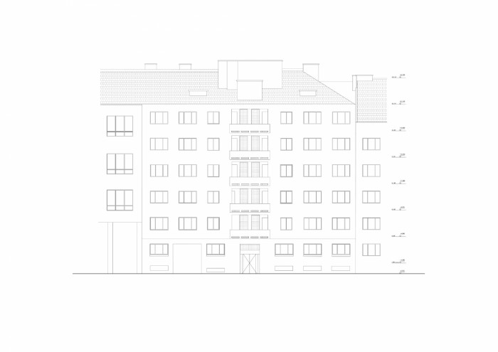 Nový raster okien vizuálne spojil pôvodný dom s nadstavbou do jedného objemu. V dvorovej časti sme doplnili dlhé, priebežné loggie. Na najvyššom podlaží sú dva veľké byty s rekreačnými patiami. Nový výťah a úpravy v spodnej hale umožnili bezbariérový prístup zo strany ulice. Dom je prvou etapou pripravovanej rekonštrukcie areálu bývalých tlaciarní Svornosť, ktoré sa premenia na objekt s loftovými bytmi.