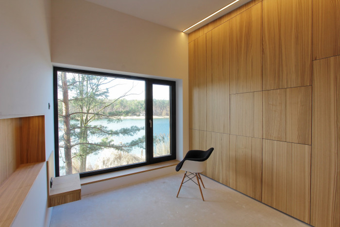 Celkové hmotovo-priestorové usporiadanie chaty je riešené tak, aby čo najviac splynulo so zalesneným borovicovým charakterom okolitej krajiny. K tomuto prispieva aj drevená prevetrávaná fasáda a začlenenie do zvažujúceho sa terénu k jazeru. Dispozičné riešenie domu vychádza z požiadaviek investora, orientácie svetových strán, maximálneho využitia výhľadu, ktorý poskytuje dané miesto a kontakt so záhradou a jazerom.