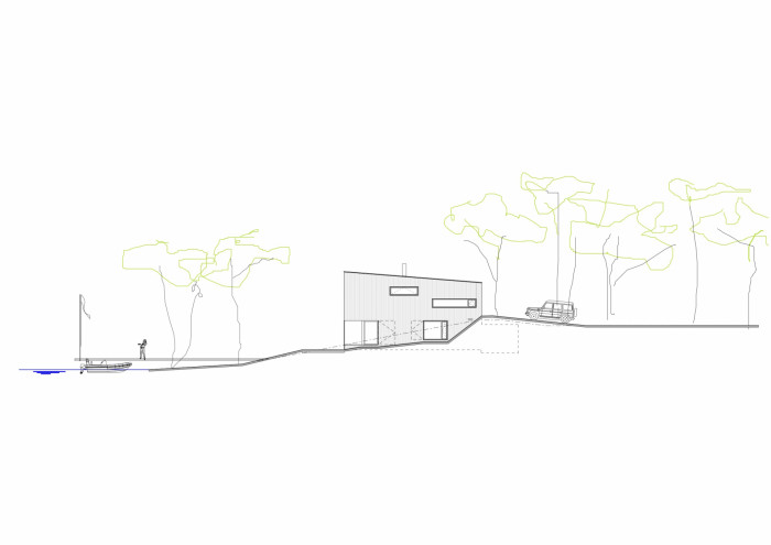 Umiestnenie novostavby chaty na pozemku rešpektuje a využíva trvar terénu, ktorý sa v polovici začina zvažovať smerom k jazeru. Práve tieto terénne podmienky umožnili včleniť objekt tak, že jeho zadná časť je jednym podlažím zapustená do terénu.