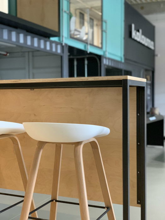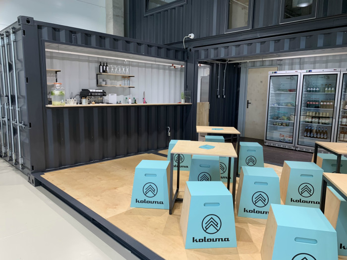 Každý kontejner plní jinou funkci. Nábytek je (kromě kancelářských židlí) vyroben na míru, aby vyhovoval specifickému prostoru lodního kontejneru. Dominantním materiálem je břízová překližka, lakovaná v transparentním laku. Dále jsou použity kovové prvky z teplé černé oceli, taktéž lakované v transparentním laku. V kuchyňské přípravě bistra je námi dodána pracovní deska z umělého kamene Corian, vyrobeno zcela na míru. Barvy kontejnerů jsou nalakovány dle firemního manuálu. Překližka je rovněž firemním materiálem používaným v interiérech prodejen a dalších objektů firmy KOLOVNA.