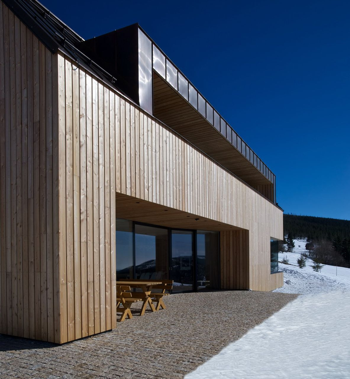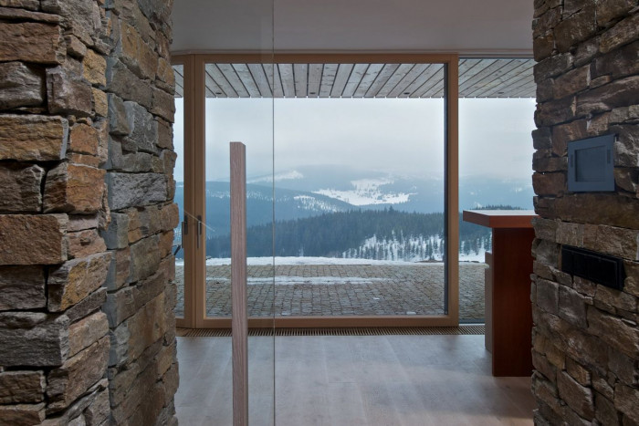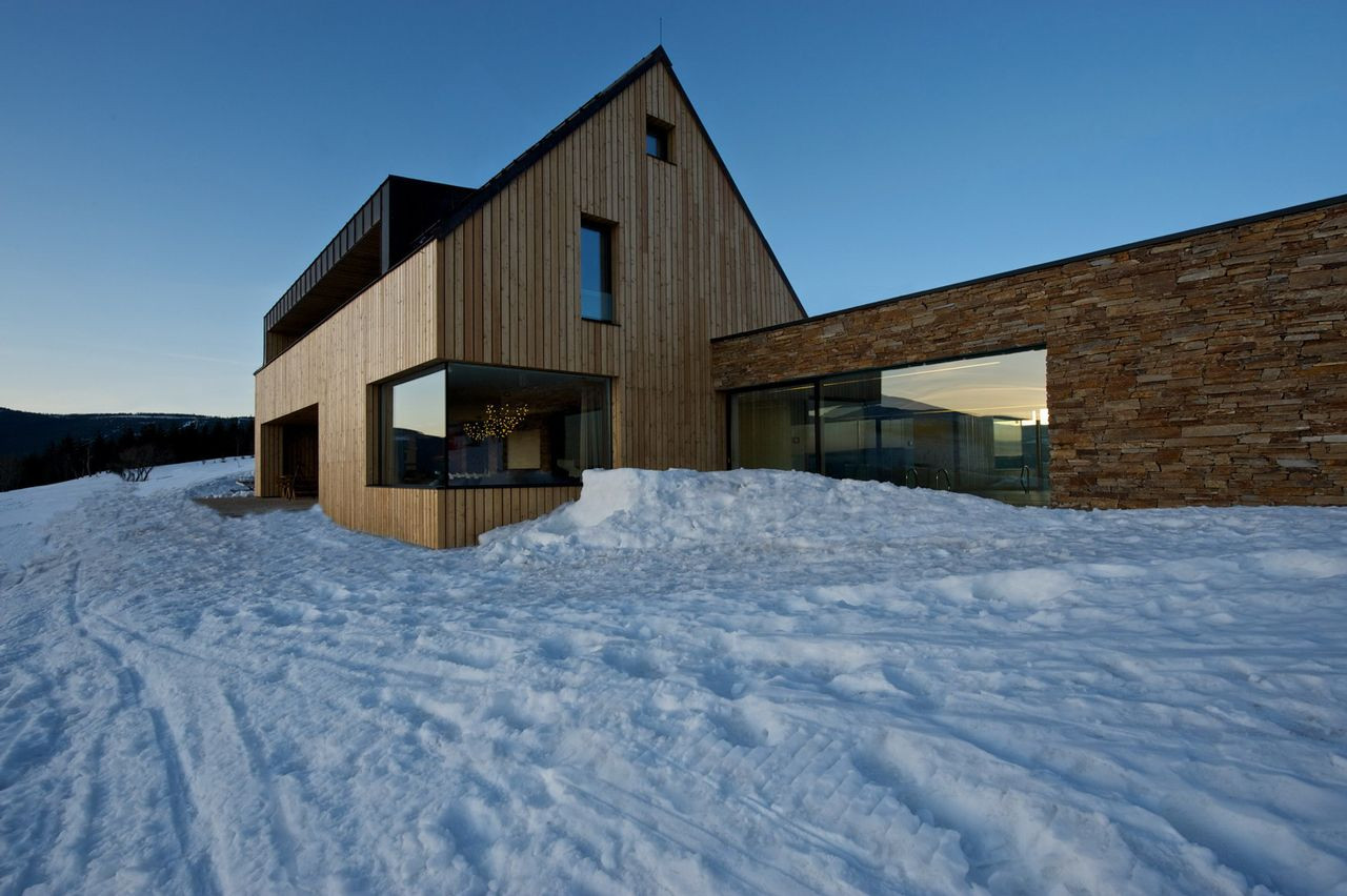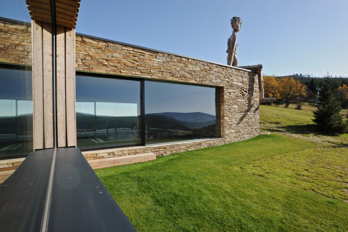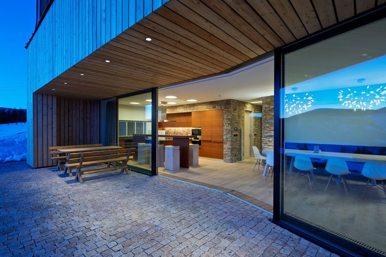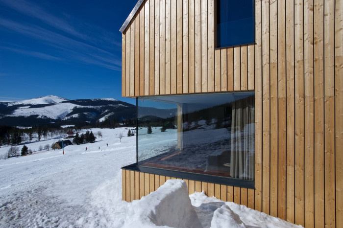 Hlavní jednoduchá hmota je členěna zapuštěnou terasou lichoběžníkového tvaru v přízemí a v patře horizontálním prvkem lodžie. Fasády jsou dále členěny velkými okny s bezrámovým zasklením, které umožňují nerušený výhled na horské scenérie za každého počasí.