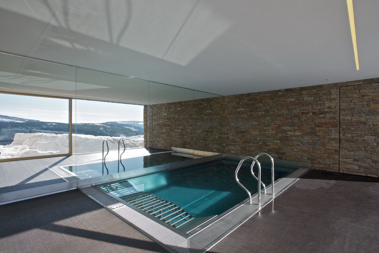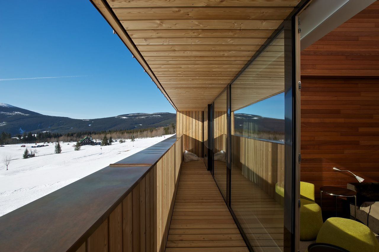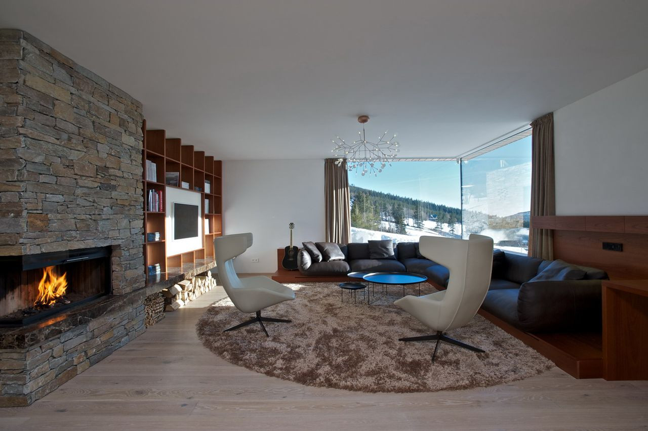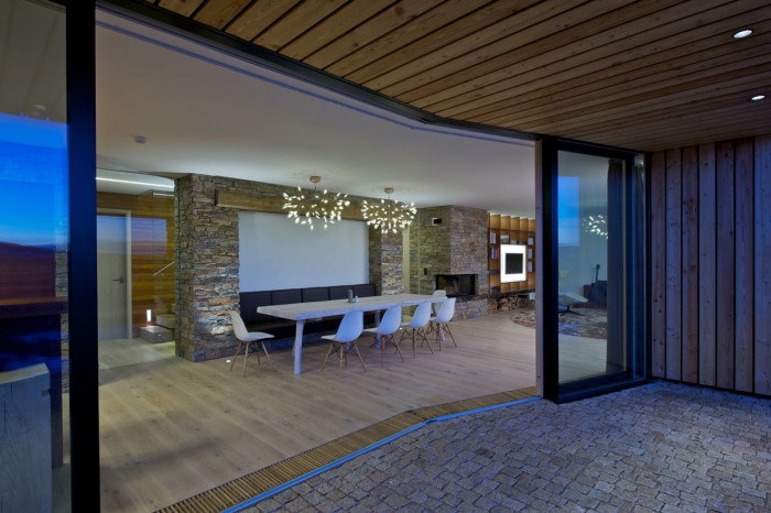 Hlavní jednoduchá hmota je členěna zapuštěnou terasou lichoběžníkového tvaru v přízemí a v patře horizontálním prvkem lodžie. Fasády jsou dále členěny velkými okny s bezrámovým zasklením, které umožňují nerušený výhled na horské scenérie za každého počasí.