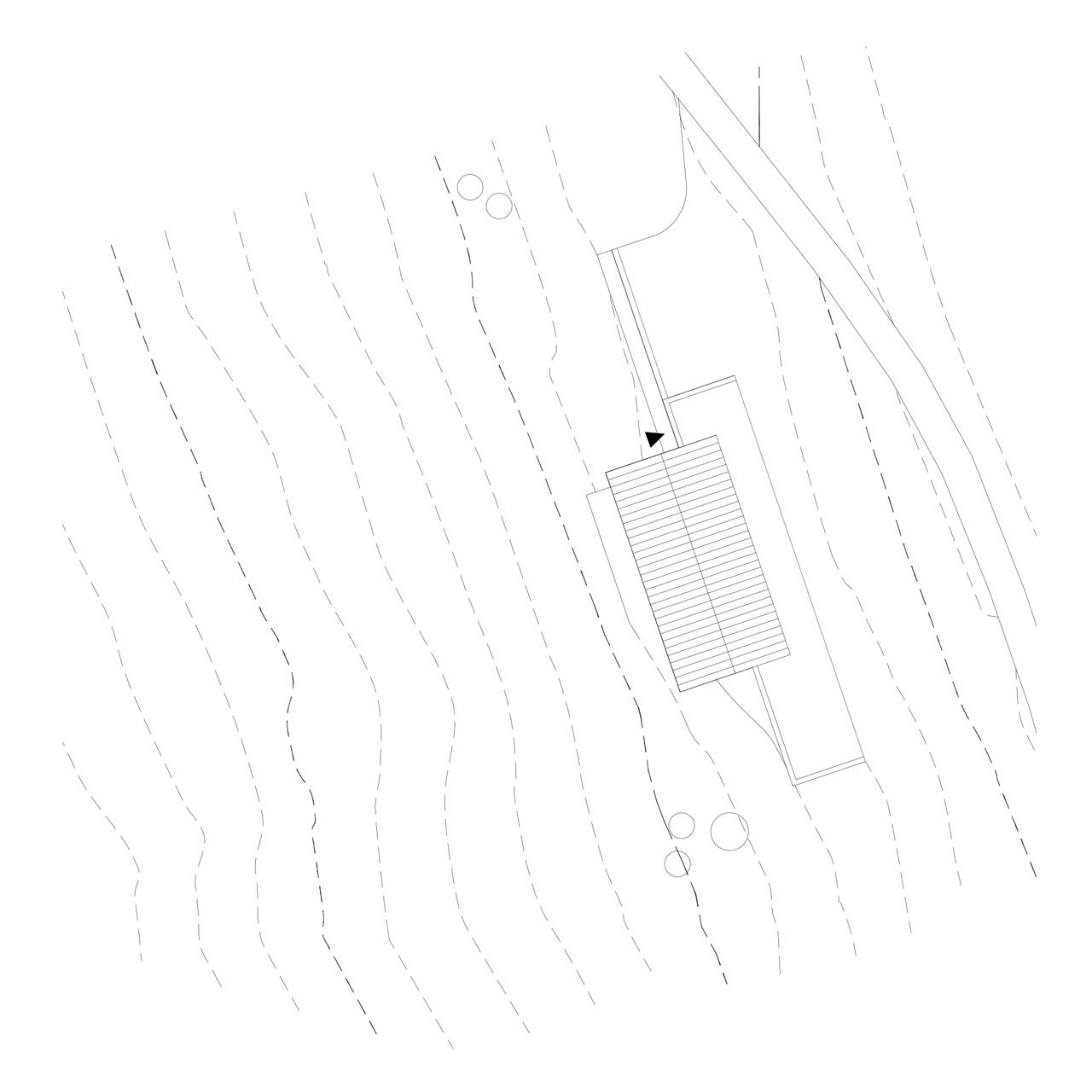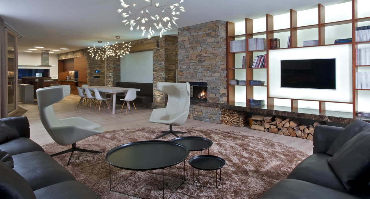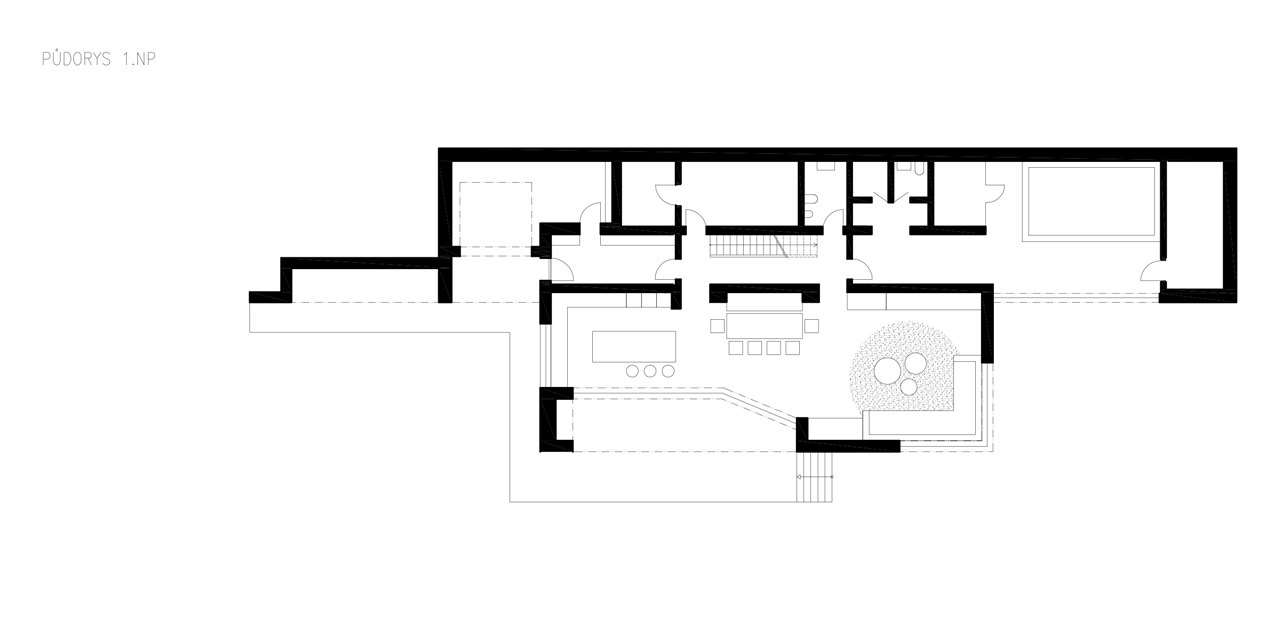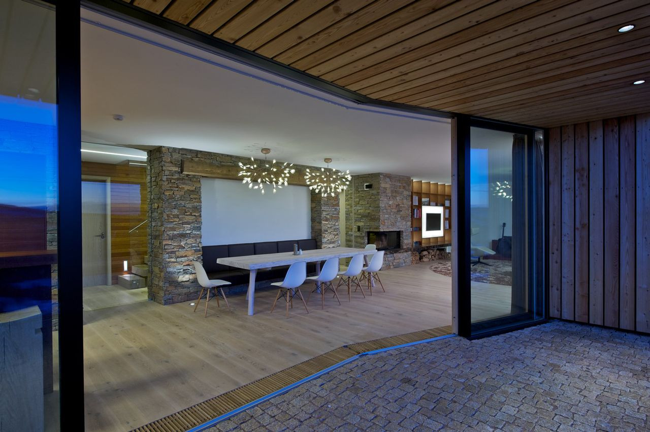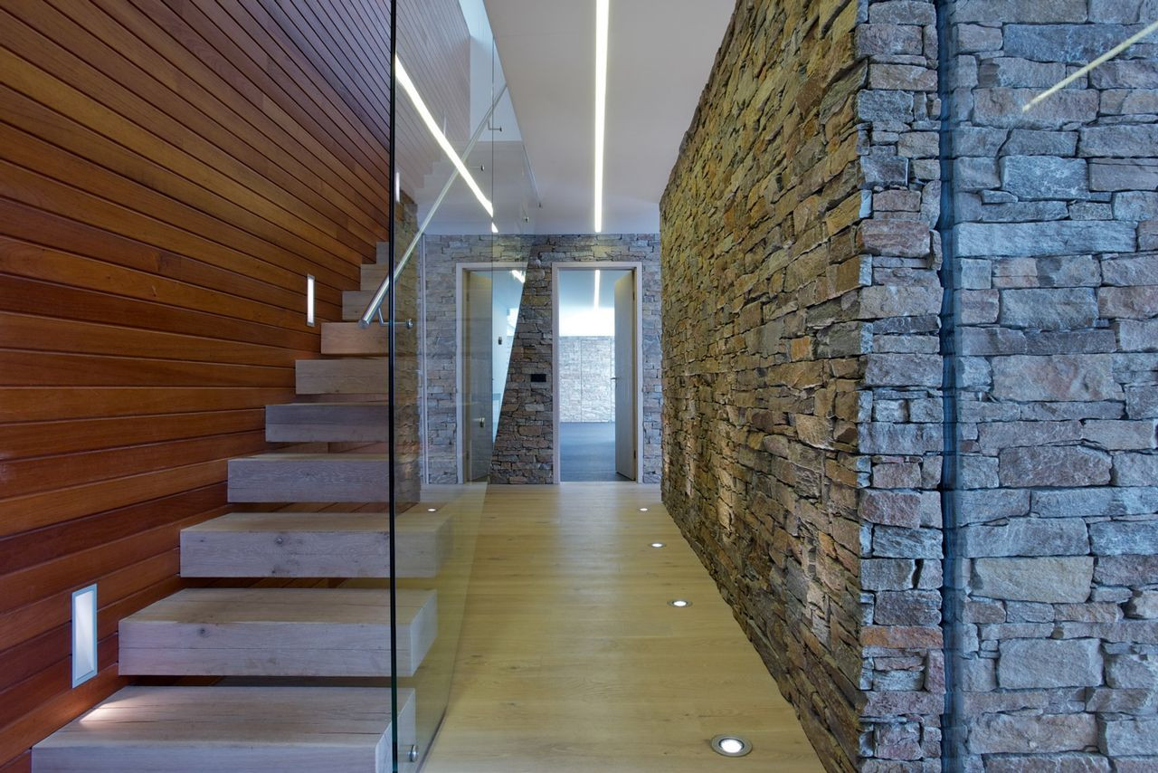 V přízemí je situován obytný prostor s kuchyní, jídelnou a krytou terasou. Komunikační koridor ve středu objektu, jehož dominantou je masivní dubové schodiště, umožňuje přímý přístup do všech částí domu, propojuje obytný prostor s patrem, bazénem i technickým zázemím. V prostoru bazénu a spa je použitý celoplošný zrcadlový obklad. V kombinaci s kamenným obkladem stěny má za cíl kromě optického efektu také umocnění dojmu z výhledu do krajiny.