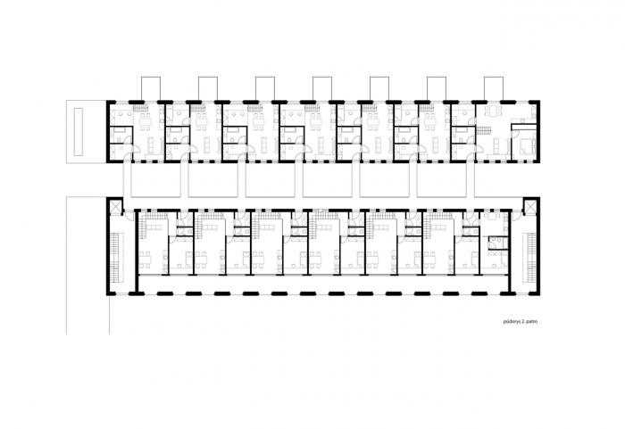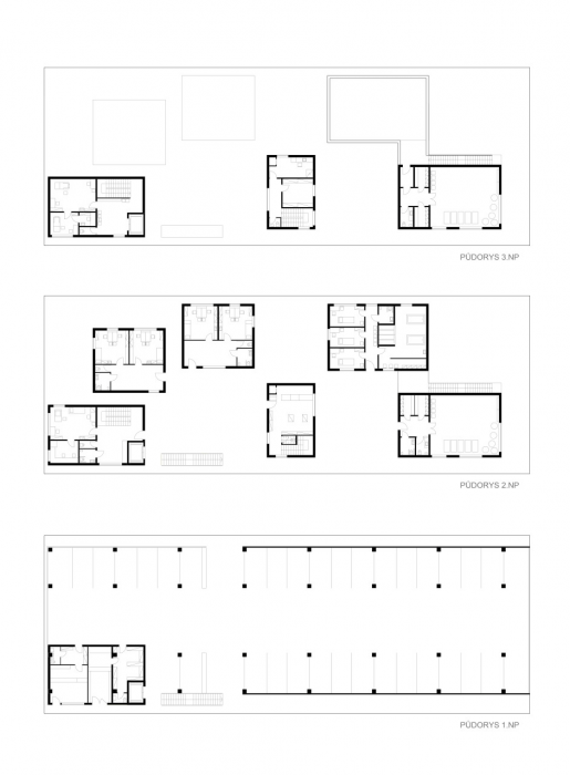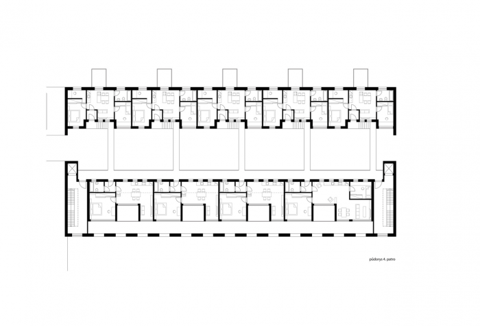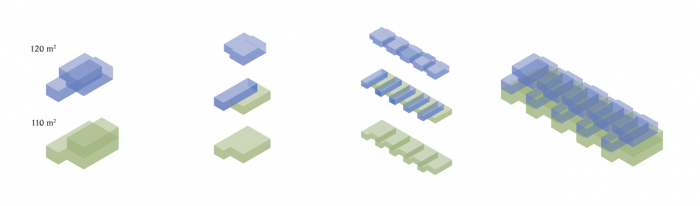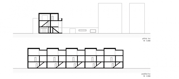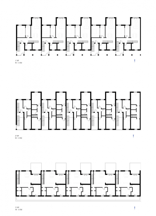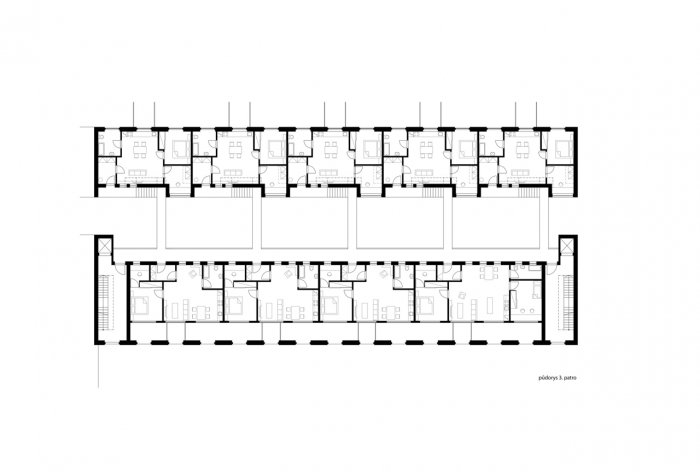 Pět vstupů do domu a pravidelný rastr oken a sloupů by mohl napovídat i o rigidním uspořádání uvnitř. Ve skutečnosti se jedná o dva typy mezonetových bytových jednotek, které se do sebe vzájemně ve druhém podlaží proplétají. Bydlení v takových bytech je určeno především pro rodiny s dětmi, které vyhledávají pocit soukromí ale zároveň nechtějí být odříznuti od veškerého okolního dění. Mohou vysedávat společně se sousedy na dvoře, popíjet kávu na zápraží, či grilovat na vlastní zahradě nebo terase.