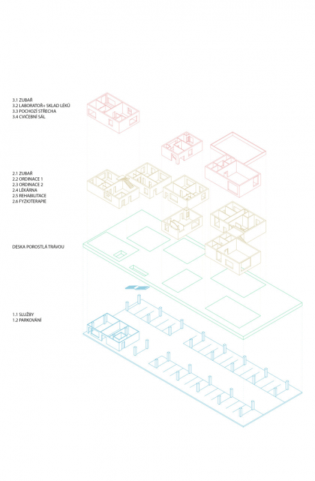 Tím, že zvedám kliniku o jedno patro, ziskávám přímou návaznost na pěší cestu do centra a taky možnost umístění parkovacích ploch a prostorů pro služby v přízemí. Principem mého projektu bylo vytvořit přijemné zelené prostředí pro pracovníky a navštěvníky kliniky. Oproti dlouhým stísněným chodbám navrhuji otevřené zelené prostory.
