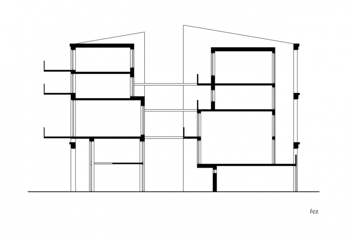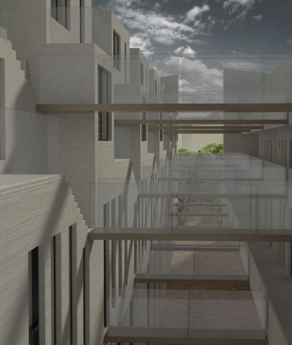 V jižním traktu navazující na soukromý prostor je dvojitá fasáda – původní nosná stěna tvoří přirozenou bariéru proti přehřívání. Za ní se nachází meziprostor pro terasu a balkóny z nichž se vstupuje do bytových jednotek. V objektu jsou komunikace v prostoru mezi trakty. V přízemí jsou byty se vstupy orientovány přímo do soukromé části s vlastní předzahrádkou.