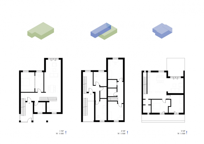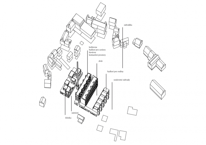 Zachováváme tři linie hmot a využíváme i prostor mezi nimi. Do nejsevernější linie navrhujeme kliniku, která by měla poskytnou dostatek zázemí a komfortu pro lékaře, kteří dnes pracují v ordinacích roztroušených po celém městě. Hmota kliniky se zasouvá do terénního zlomu, který se svažuje směrem od náměstí a je tedy tak velmi dobře přístupná. Bývalá tovární hala slouží hned několika funkcím. Nabízí bydlení pro seniory, komunitní centrum, archiv a knihovnu s kavárnou. Zvenčí si zachovává původní tvář s veškerými vrstvami a nánosy historie, ale uvnitř se chová jako zcela nová struktura. Třetí linie je tvořena novým bytovým domem. Ten se už pomalu začíná rozpadat do roztroušenější části hrádecké zástavby a současně se snaží nabídnout ty kvality bydlení, které hrádečtí vyhledávají. Tyto tři rovnoběžné linie částečně uzavíráme k nim kolmou hmotou, do které jsme umístili kavárnu, která navazuje na knihovnu v hale továrny, atelier a dvě menší učebny.