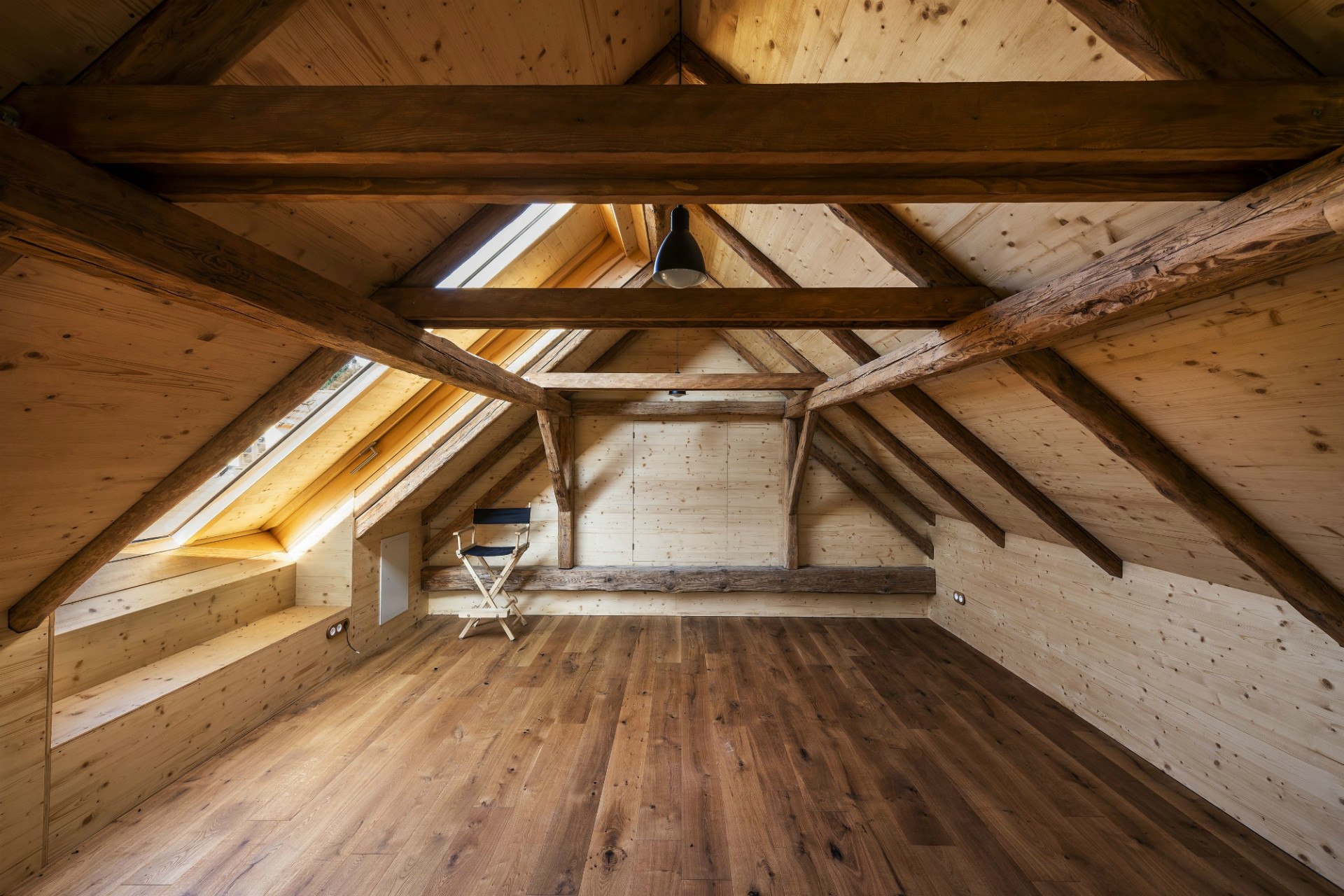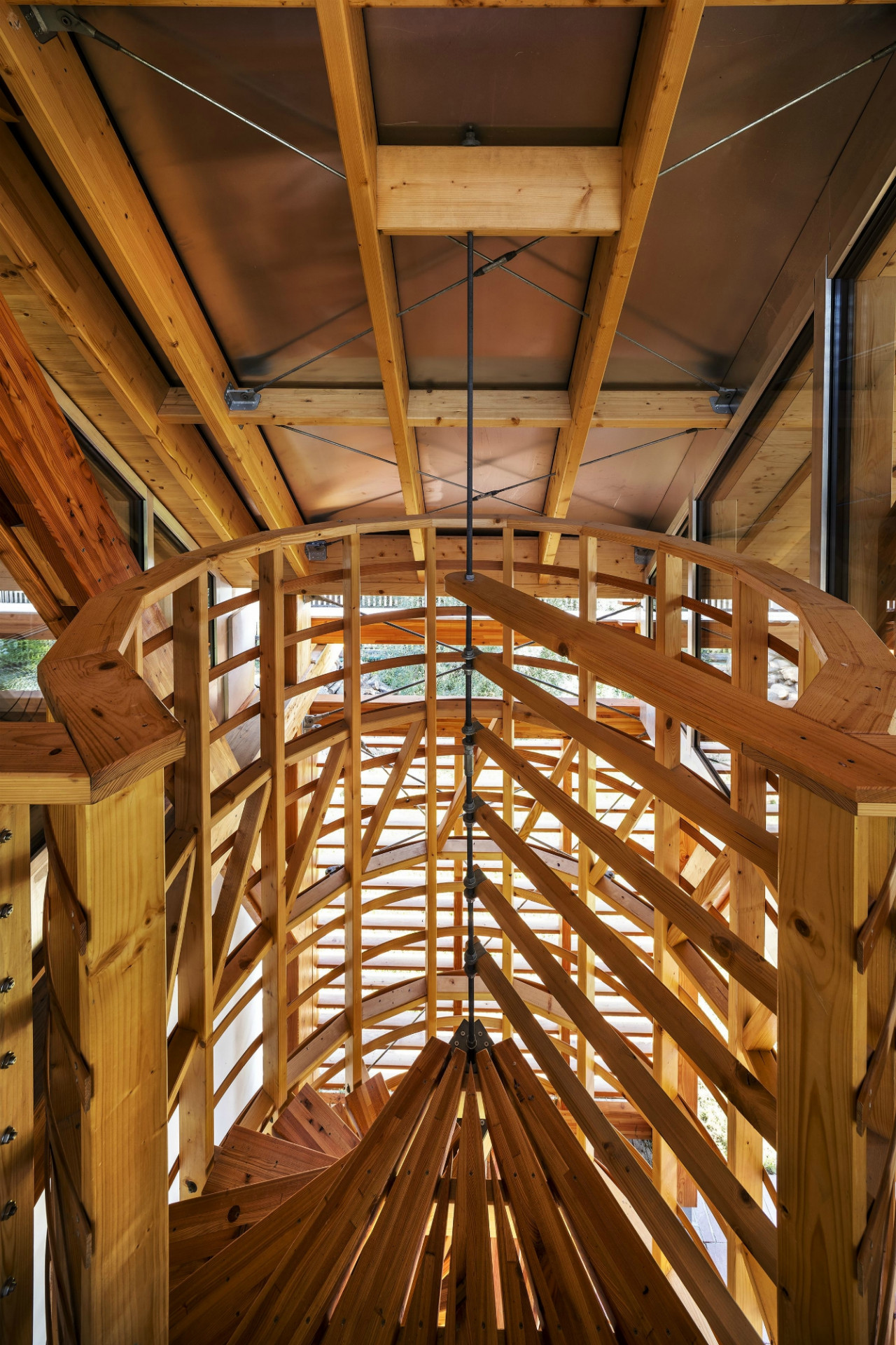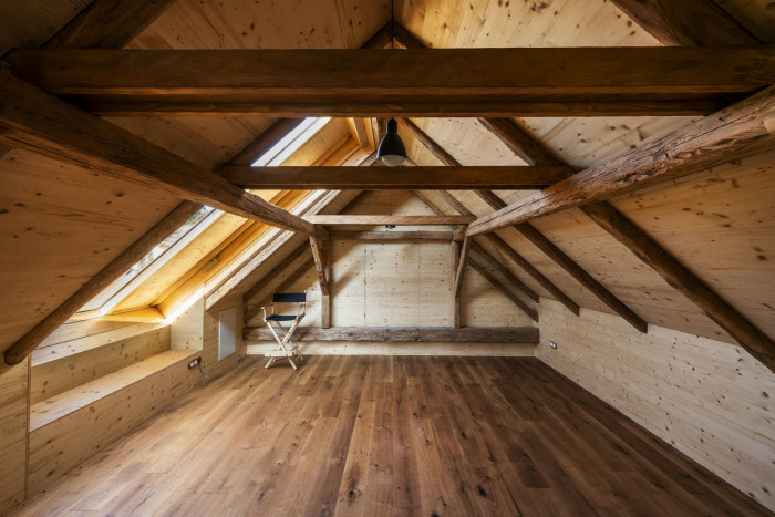 V přízemí je složené dřevo. Po točitých schodech vystoupáte do patra na lávku. Ta spojuje půdu staré budovy s podkrovím nové. V každé z nich je jediná místnost. Ve staré půdě hvězdárna a v nové přístavbě pozorovatelna. V pozorovatelně mezi prkny vnějšího stínění vidíte ven do okolní krajiny. Ve hvězdárně je šero a soukromí a světlo sem padá jen úzkým oknem. Část střechy se dá ale v noci odsunout a člověk může nerušeně pozorovat hvězdy.
