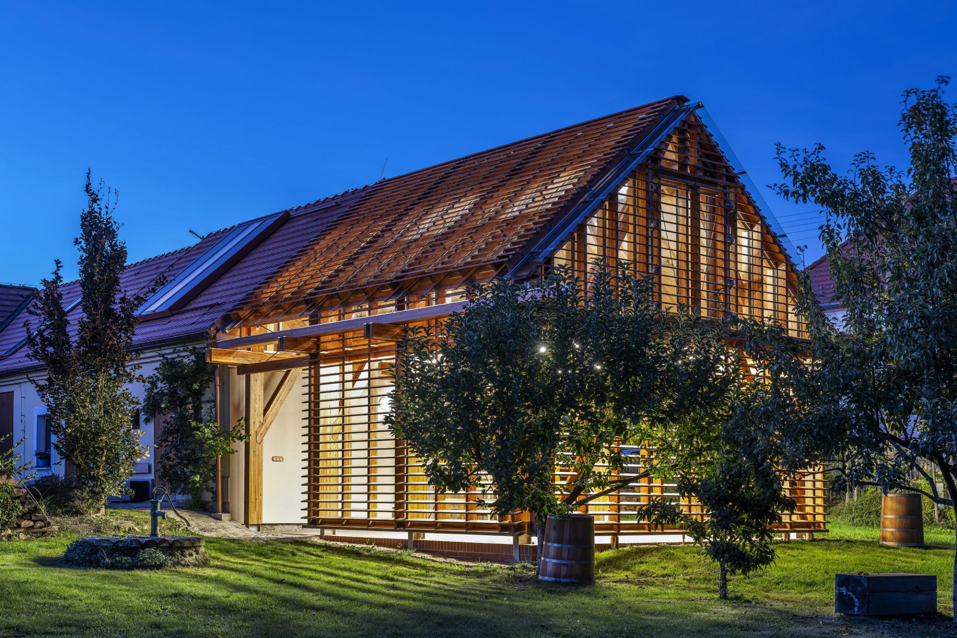 Ke starému statku v jižních Čechách si investor přál prostor pro odpočinek a relaxaci – hvězdárnu a pozorovatelnu. Prodloužili jsme hmotu jednoho křídla statku o poloprůhlednou dřevěnou konstrukcí ze smrku a modřínu. Přístavba je v základním tvarovém konceptu harmonickým pokračováním původního statku ale ve struktuře a konstrukci kontrastní transparentní dřevostavbou se zenovou atmosférou.