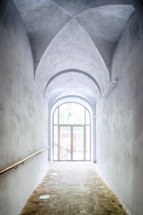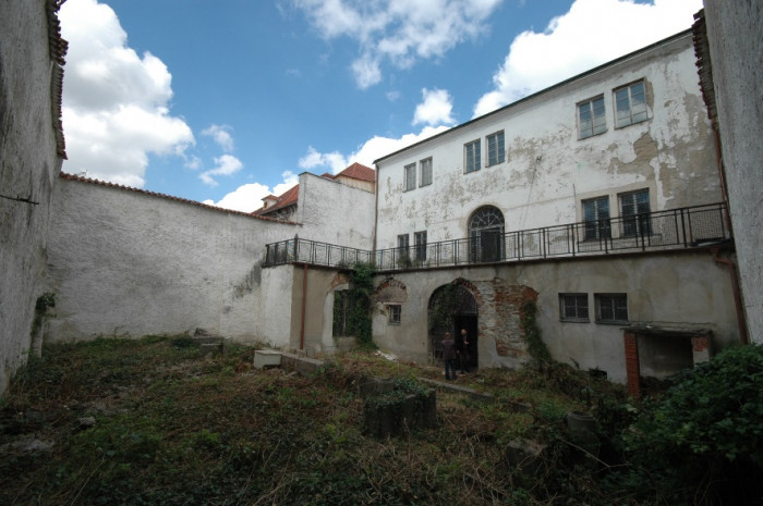 Novostavby depozitáře a spojovacího krčku rámují prostor dvora, rozdělený schodištěm na dva čtvercové dvorky o čtvercovém půdorysu, lemované obnoveným podloubím vnitřního traktu domu a kavárnou s gotickými klenbami. Štíhlý hranol přístavby výtahu, osazený na barokní podloubí v přízemí hlavního domu, uzavírá západní hranu nádvoří.
