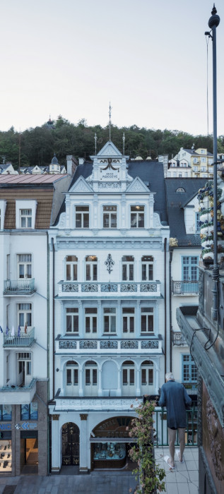 Pětipodlažní dům z konce 19.století, který je kulturní nemovitou památkou, se nachází na úzké gotické parcele v historickém jádru města Karlových Varů, v těsné blízkosti lázeňských pramenů. Svojí jižní fasádou je orientován do ulice Stará louka – jedné z hlavních lázeňských promenád. Dům je charakteristický jak svojí bohatou štukovou výzdobou se zlacenými prvky, tak i svou prostorovou traktací do třech celků. Výrazným prvkem interiéru je kromě štukové výzdoby a jemných ornamentálních leptů okenních skel, především velkorysé centrální schodiště s kovaným zábradlím a zlacenými florálními prvky.