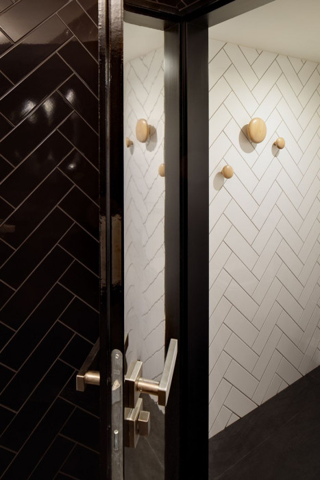 Originální názvy některých typicky asijských surovin graficky doplňují dřevěný obklad několika stěn. Zbylé vertikální plochy jsou ponechané ve středním odstínu šedé. Neštukované zdi působí útulným dojmem. Černé stropy upřednostňují spíše to, co se děje v úrovni očí, a decentně upozorňují na původní klenby. Sladěné jemné pastelové tóny interiéru doplňují různobarevné židle, včetně bílé a černé, doplňková tyrkysová barva je nabídnuta v harmonickém kontrastu se zlatavou mosazí a hřejivou mědí.