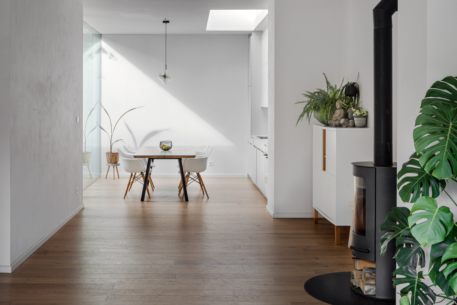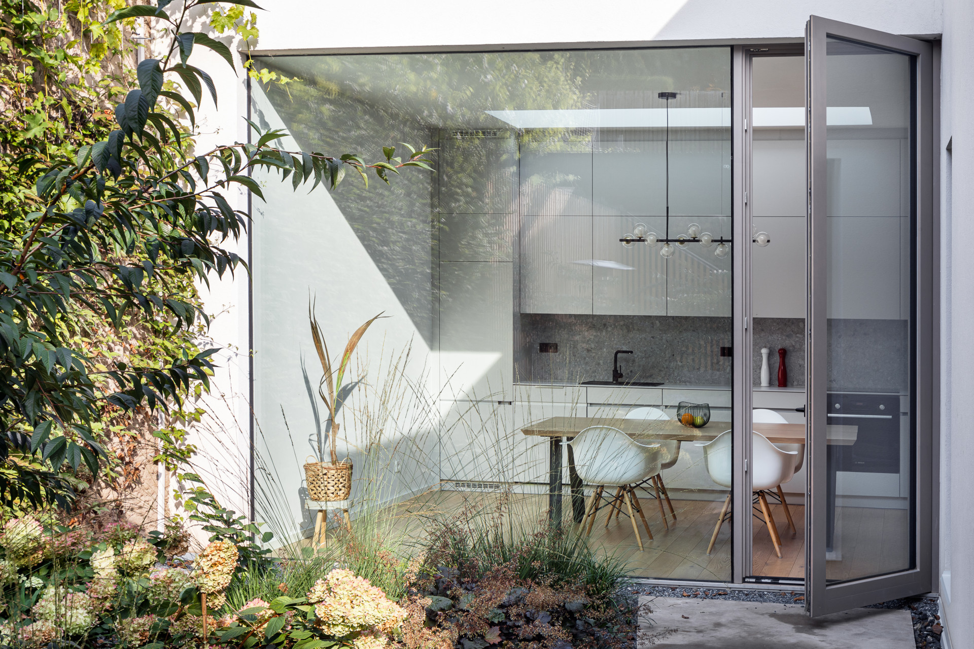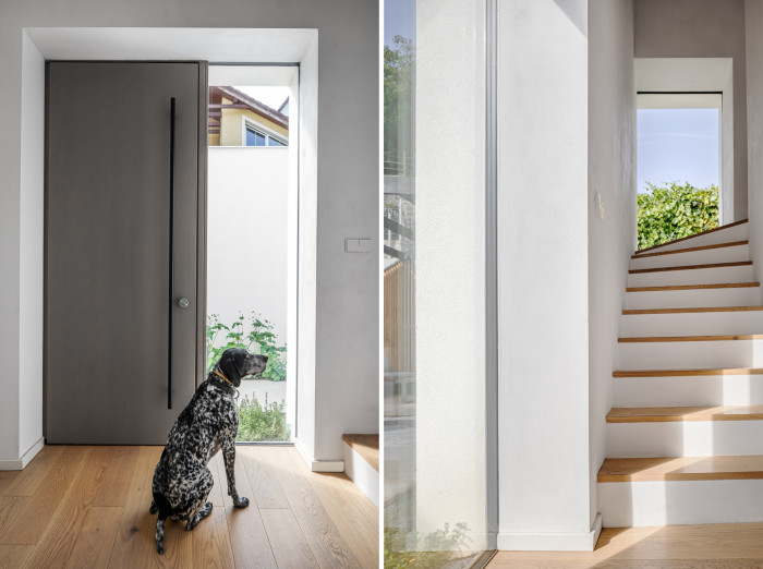 Obytná část je orientovaní na jih a díky velkému prosklení se otvírá přírodnímu parku, kde vytváří nekonečně měnící se obraz. Kuchyň s jídelnou umístěna na sever je doplněna o světlík a další velké prosklení s výhledem do intimního atria s posezením, které tak vzniká zapuštěné mezi okolní zástavbou.