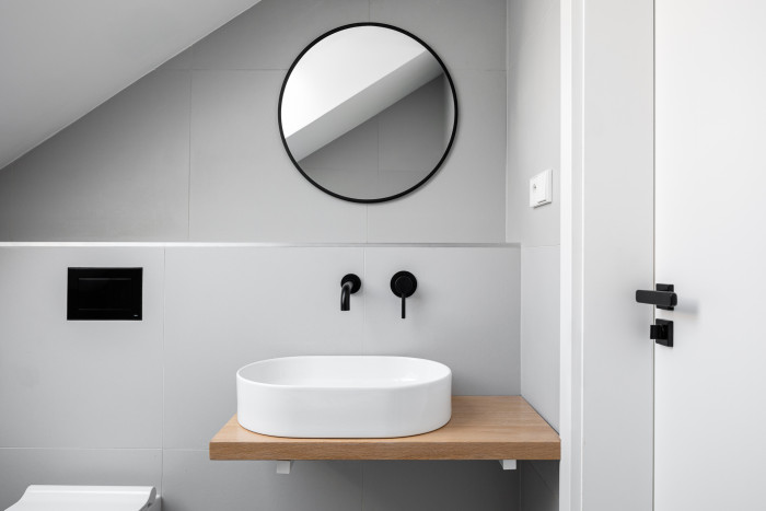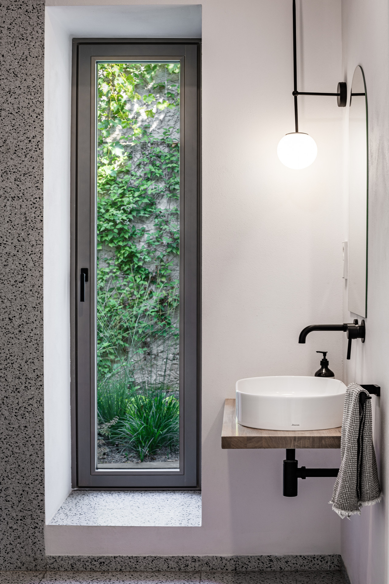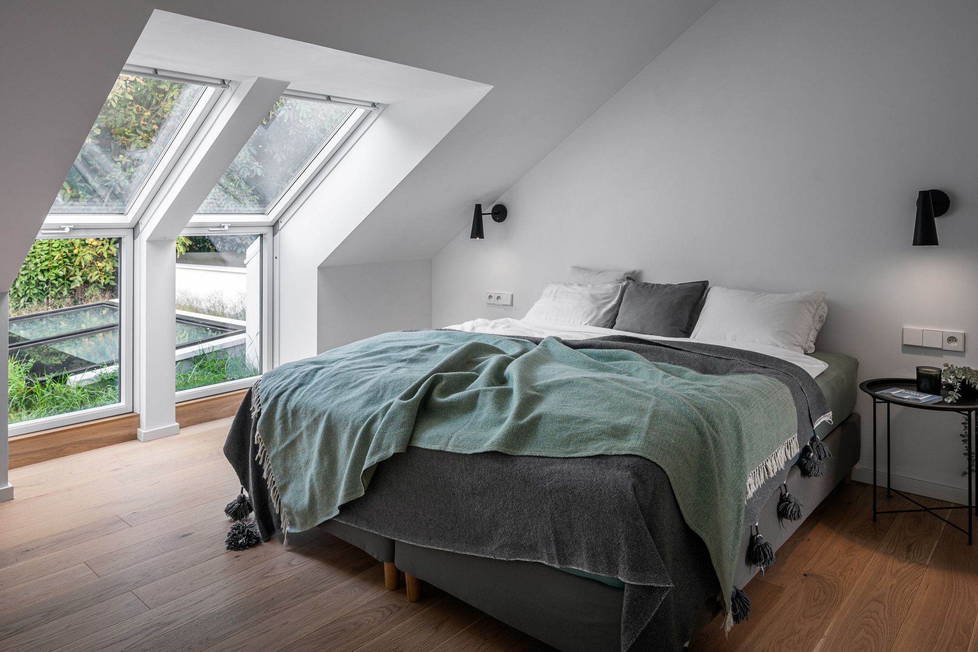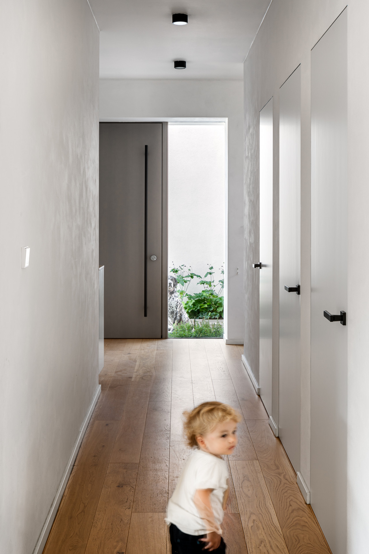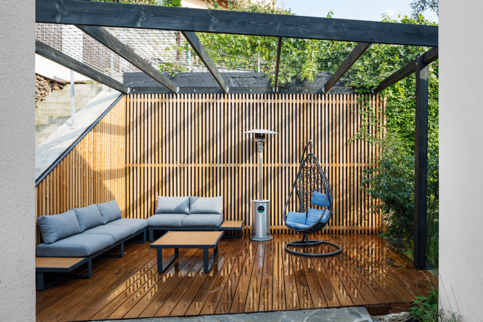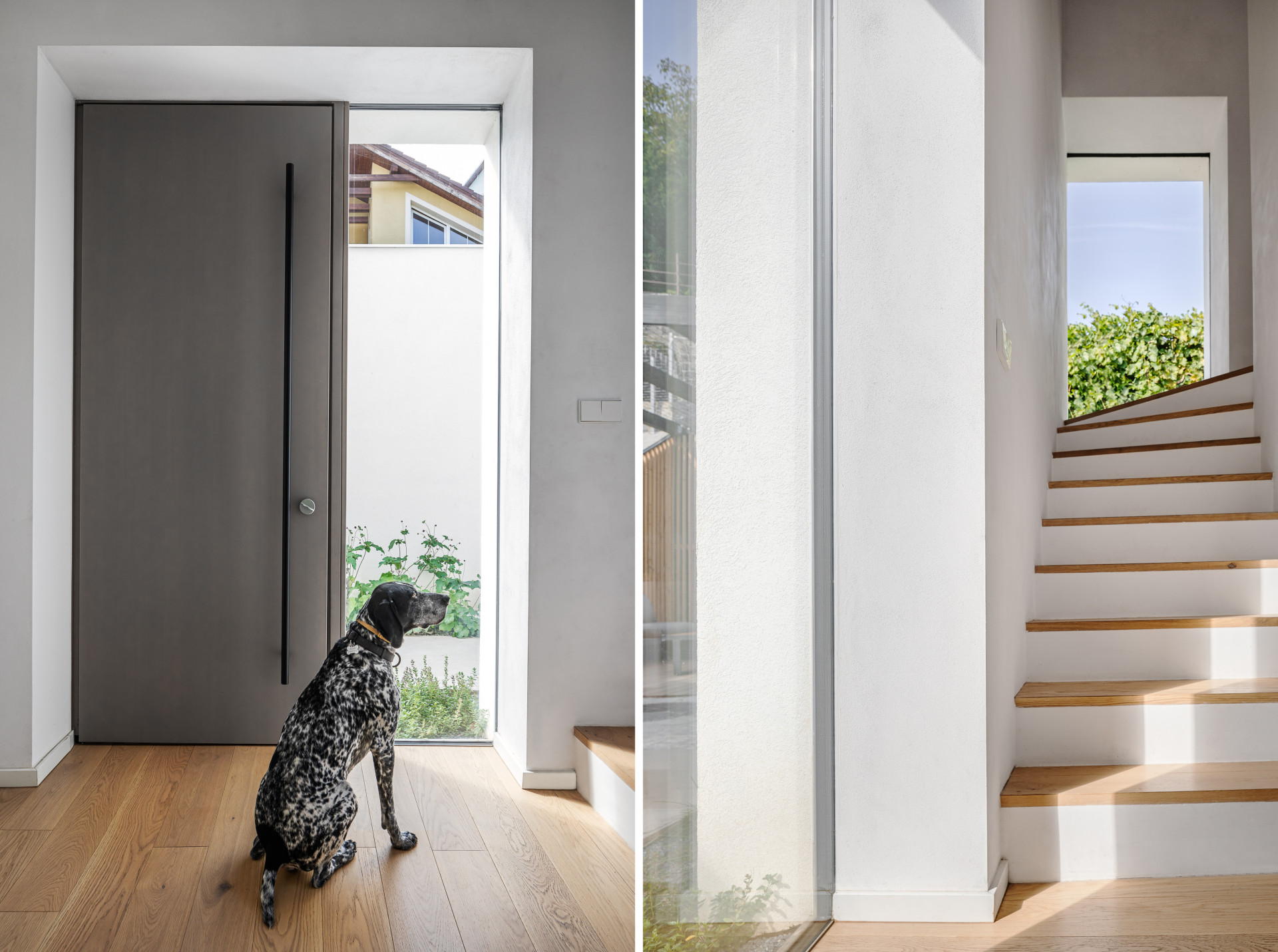 Při výstupu po schodech do patra domu je prosklení na upoutávající zeleň horní zahrady. V patře domu se nachází soukromá část s dětskými pokojemi a koupelnou, dále ložnice s přímým výstupem na zahradu, vlastní šatnou a en suite.