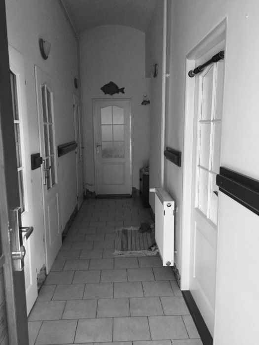V přízemí domu se nachází vstup, kde je vytvořena vstupní hala s novou pozicí schodiště. Dále je zde soukromá pracovna/pokoj pro hosty, technická místnost se vstupem do původního sklepa, koupelna a WC. Chodba vstupního prostoru je zakončena krbem, jako symbolem tepla “srdce domu”, kde se nachází velkorysý obytný prostor. Na opačném konci osy krbu je průhled do vstupní zeleně.